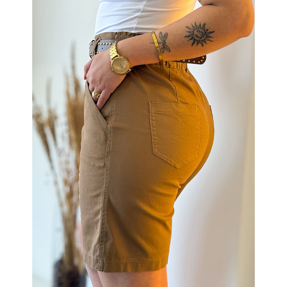 Bermuda em sarja com elastano. Modelo com dois bolsos frontais e dois bolsos traseiros, fechamento por zíper e botão para maior praticidade. Com elástico na parte de trás do cós.