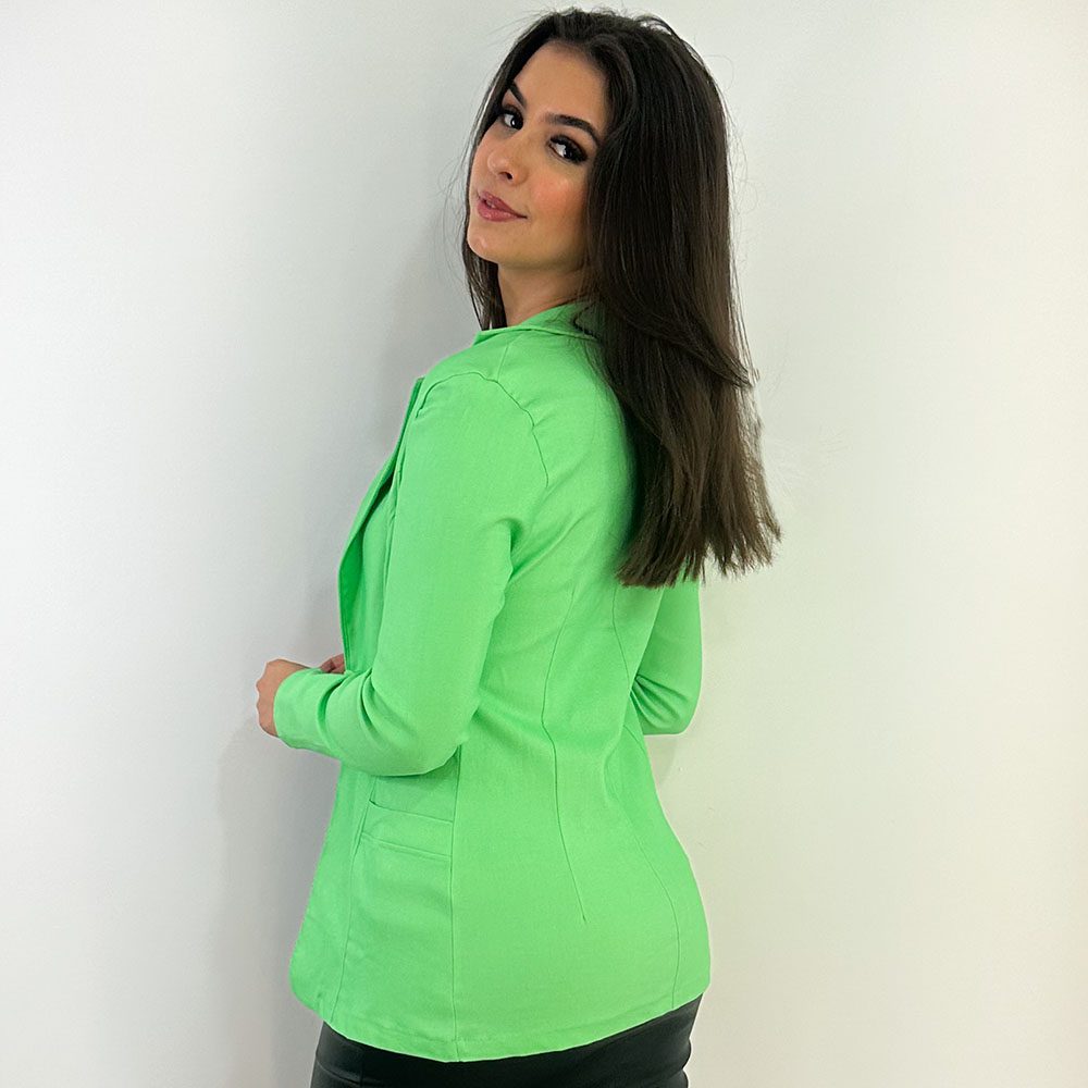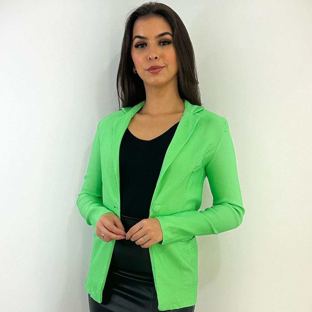 Blazer em Bengaline, dois bolsos frontais fake, abertura e fechamento com botão forrado.