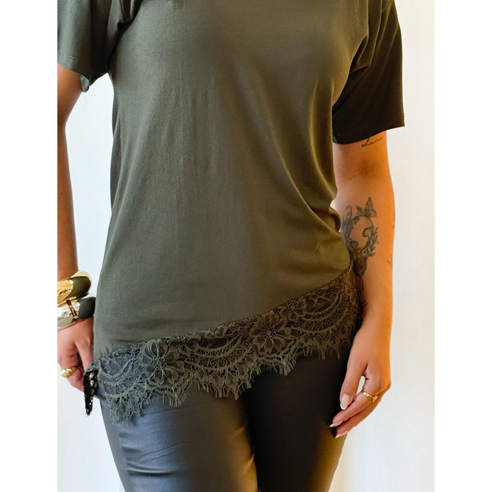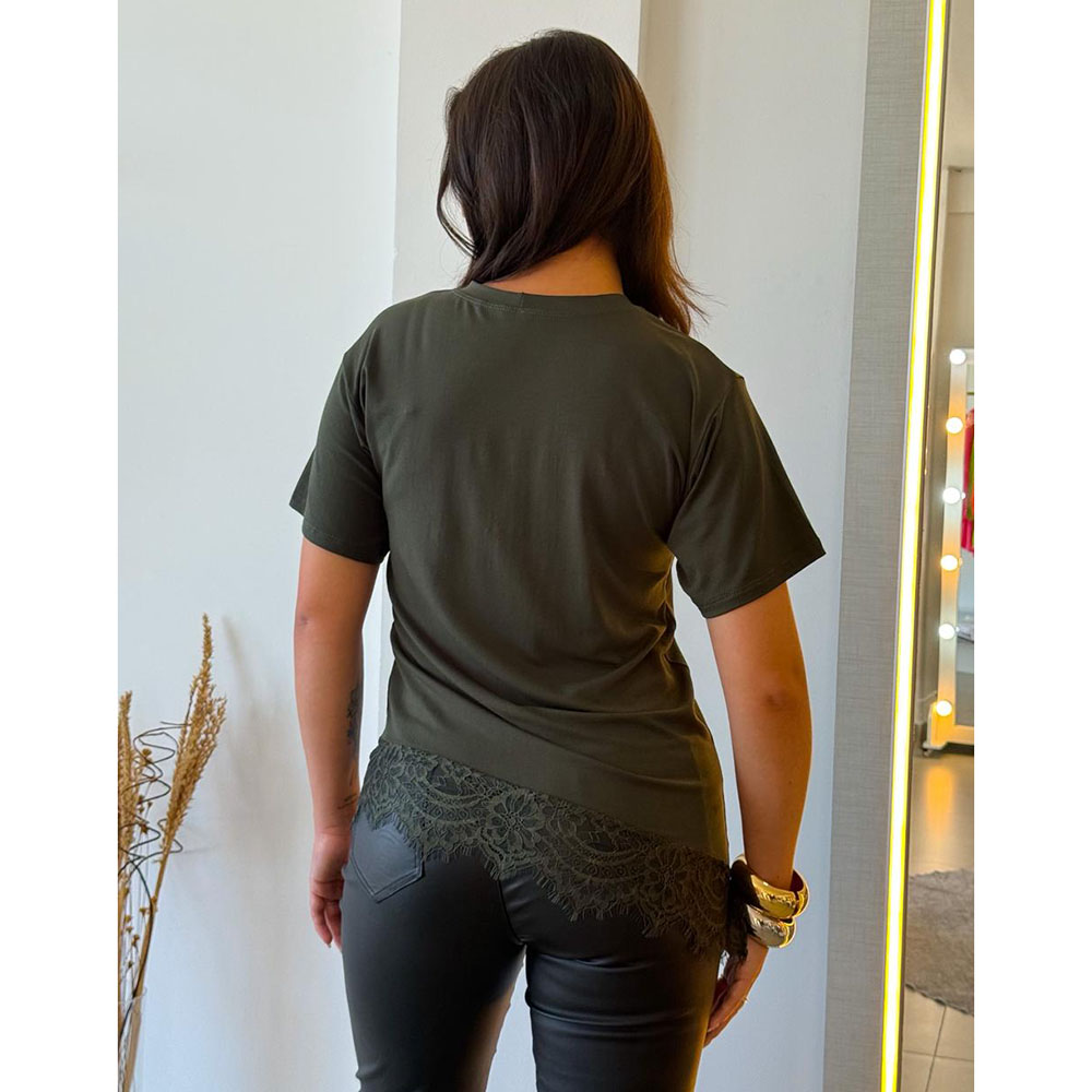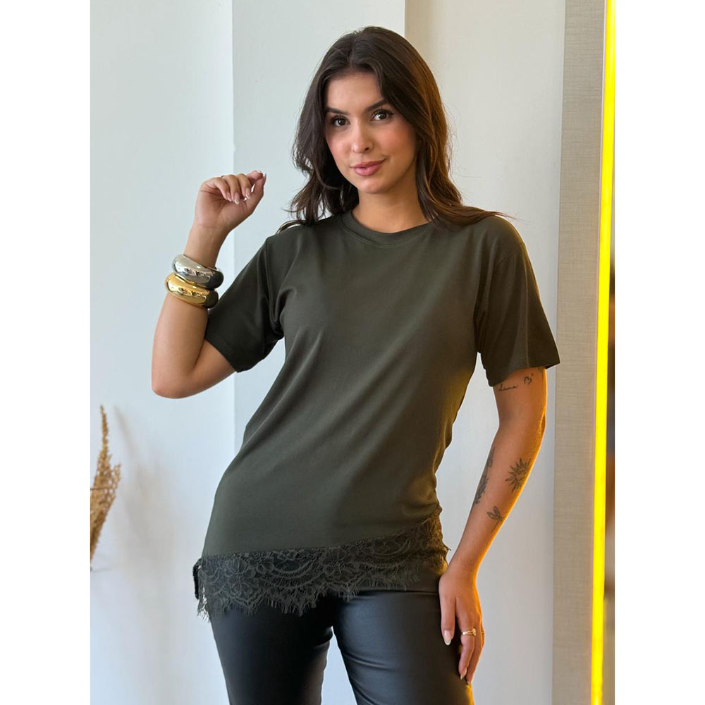 Camiseta assimétrica com detalhe em renda na barra, em tecido viscolycra, que une conforto e estilo em uma só peça. Perfeita para compor looks elegantes e casual com praticidade e sofisticação.