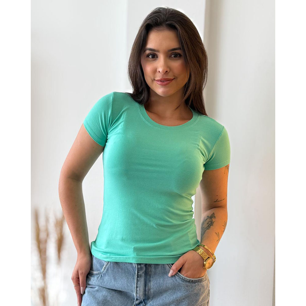 Blusa modelo baby look, com decote redondo e gola em ribana, com manga. Confeccionada em tecido viscolycra.