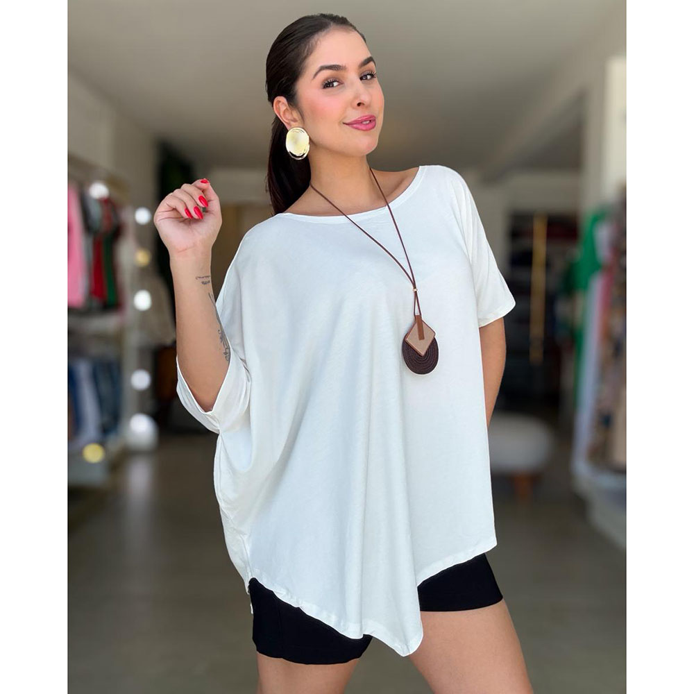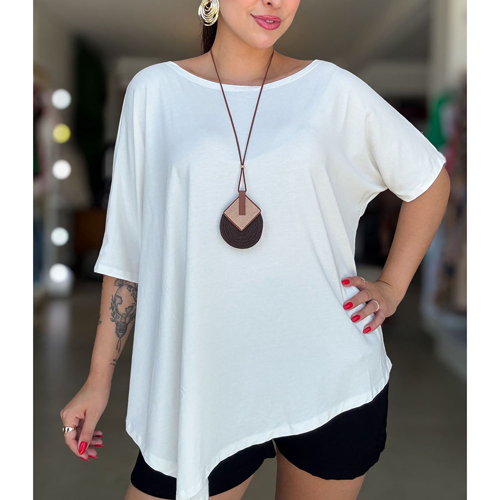 Blusa modelo Bata Recorte Bico, com gola decote canoa. Confeccionada em tecido viscolycra, uma peça elegante e casual. Acompanhada de um lindo colar de corda em couro, que adiciona charme e sofisticação ao visual, modelo do colar é sortido e enviado conforme disponibilidade em estoque.