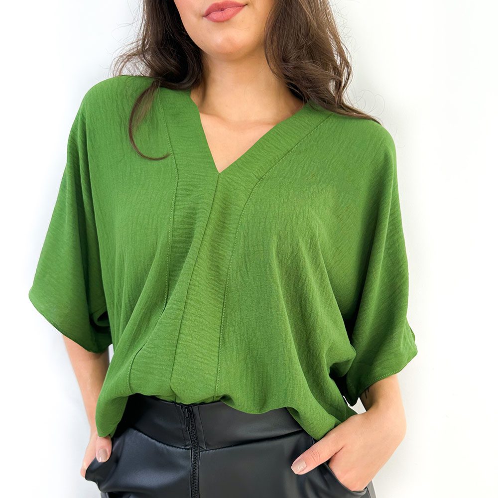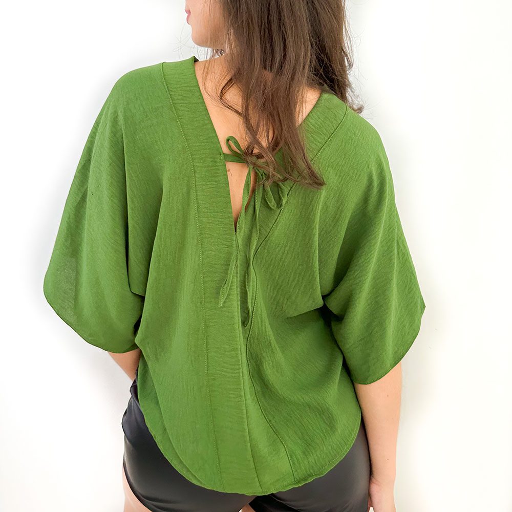 Blusa Bata, tecido duna, manga morcego, decote em V.