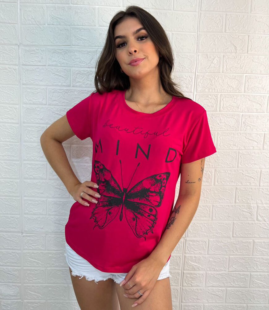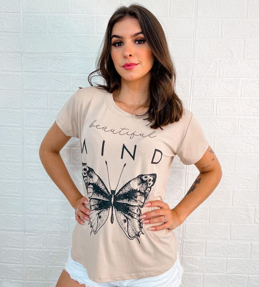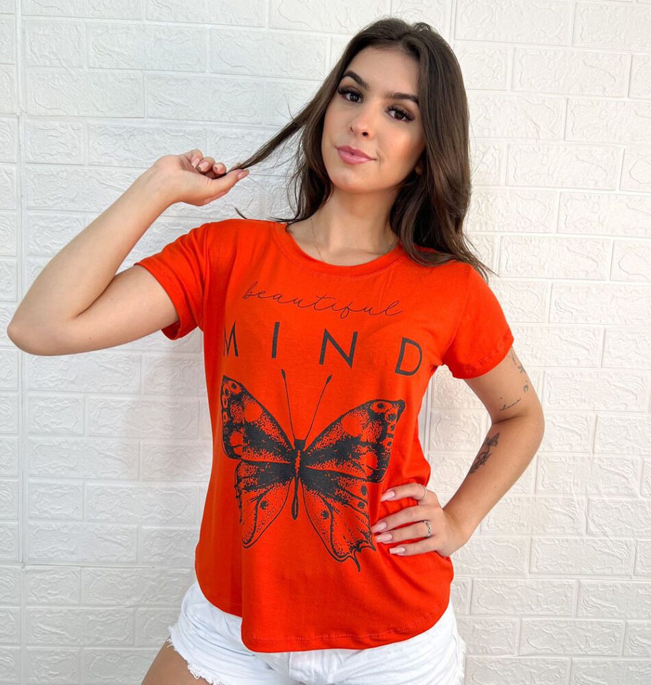 Blusa Feminina, manga curta, gola redonda, T-Shirt, com estampa de Borboleta.