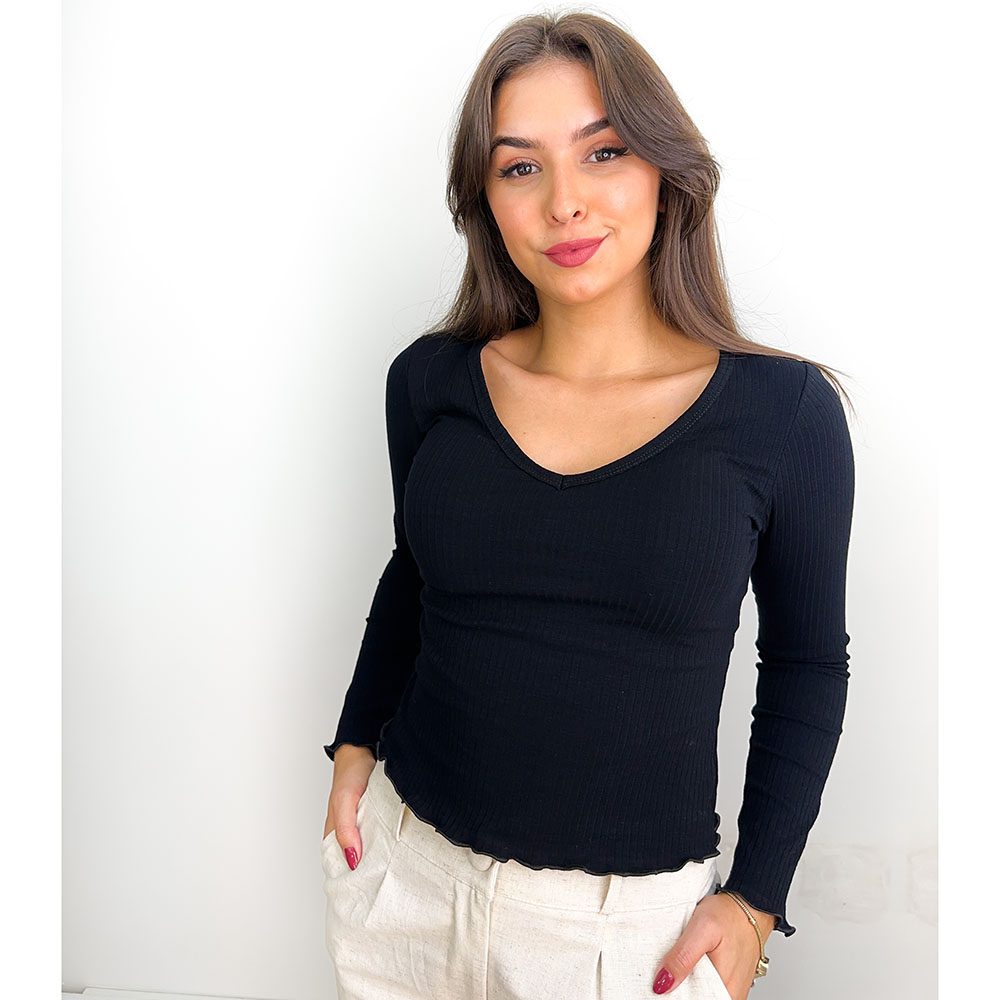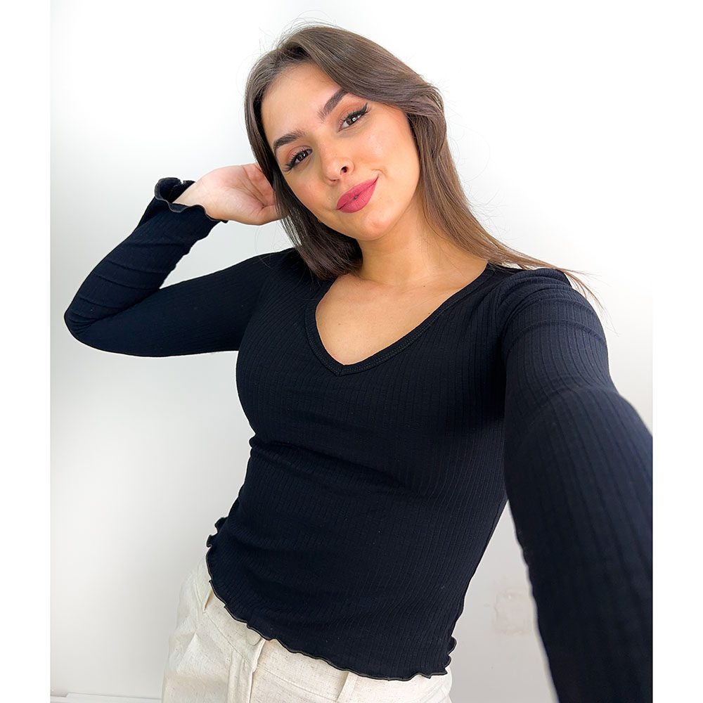 Blusa manga longa, tecido Canelado, com bojo, gola V.
