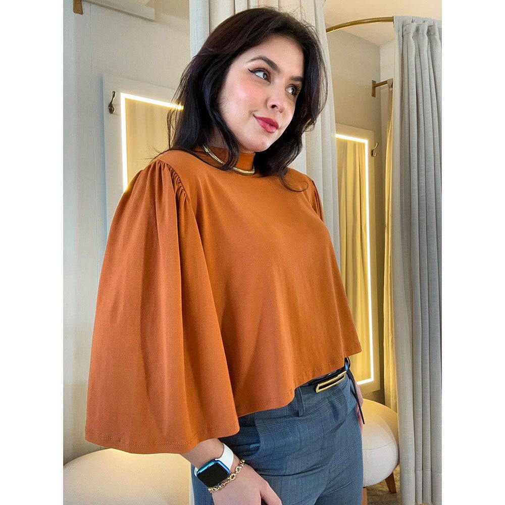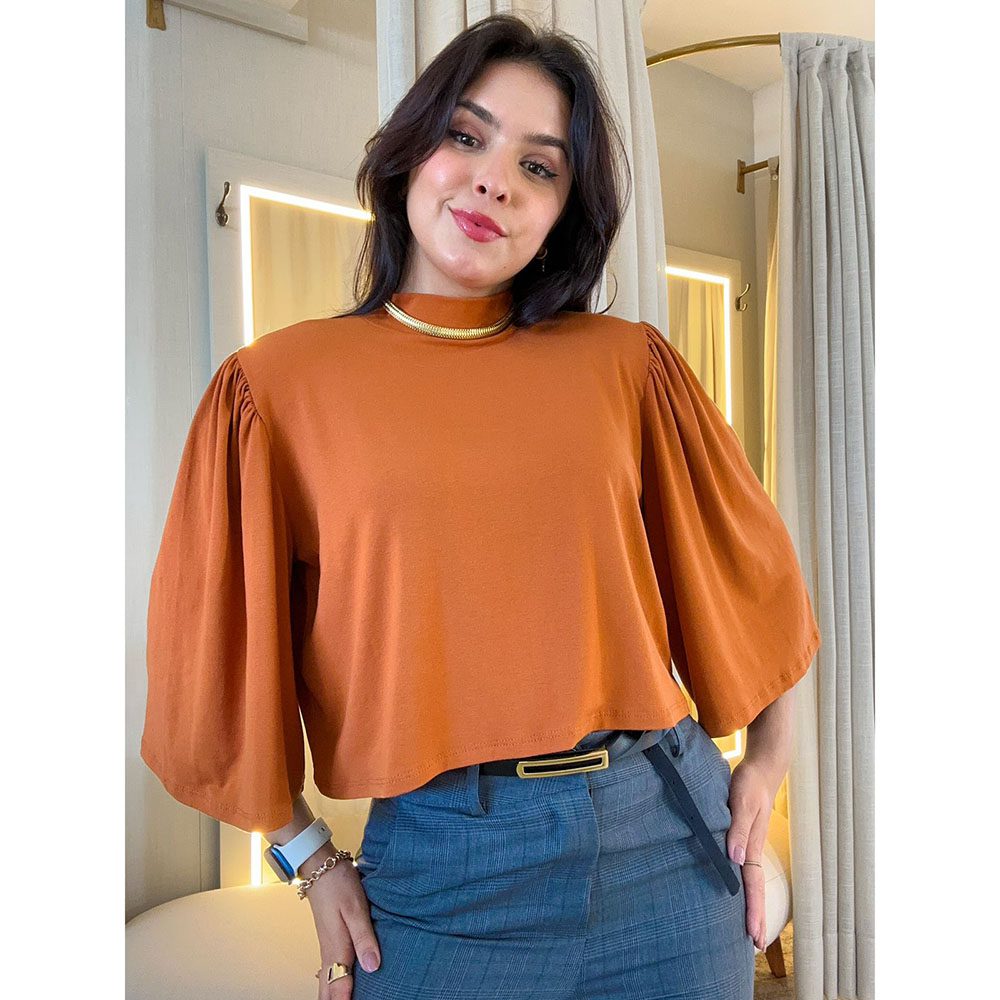 Blusa tecido viscolycra, gola alta . Meia manga com detalhes.