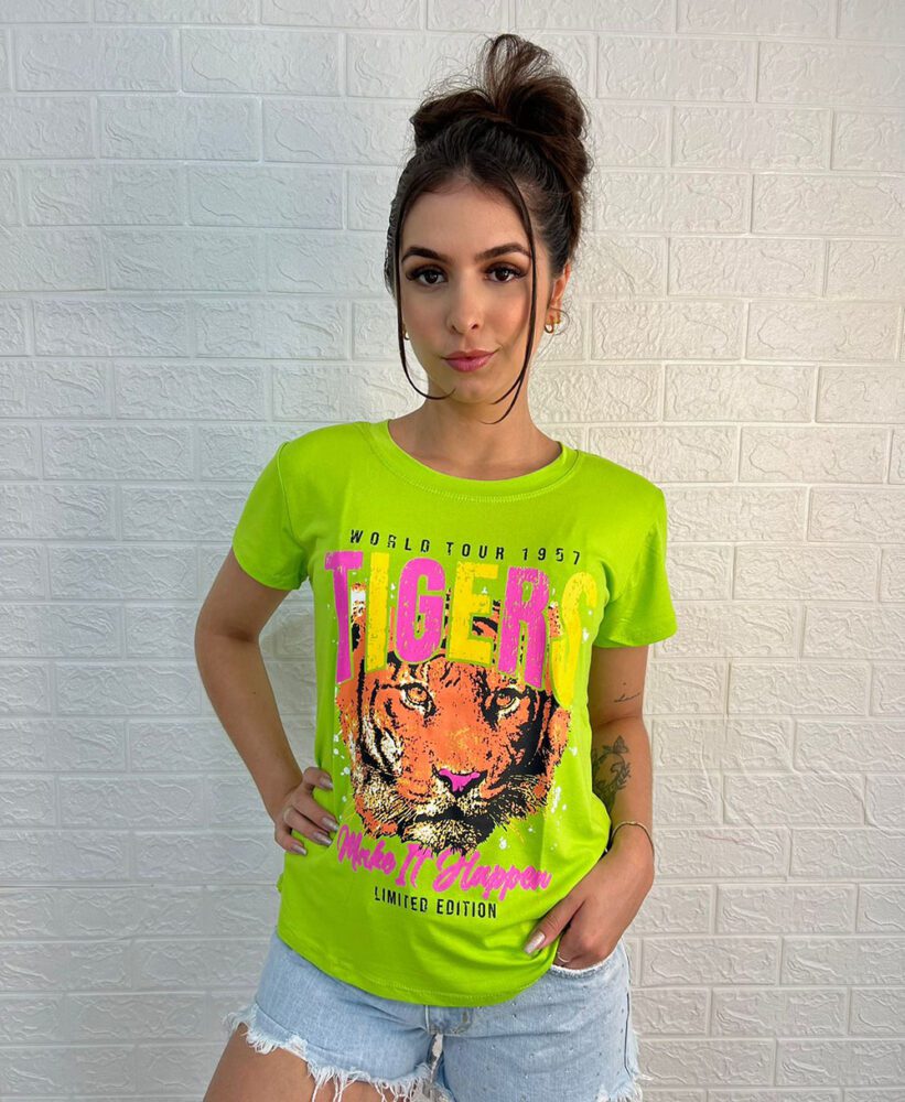 Blusa Feminina, manga curta, gola redonda, T-Shirt, com estampa de Tigers.