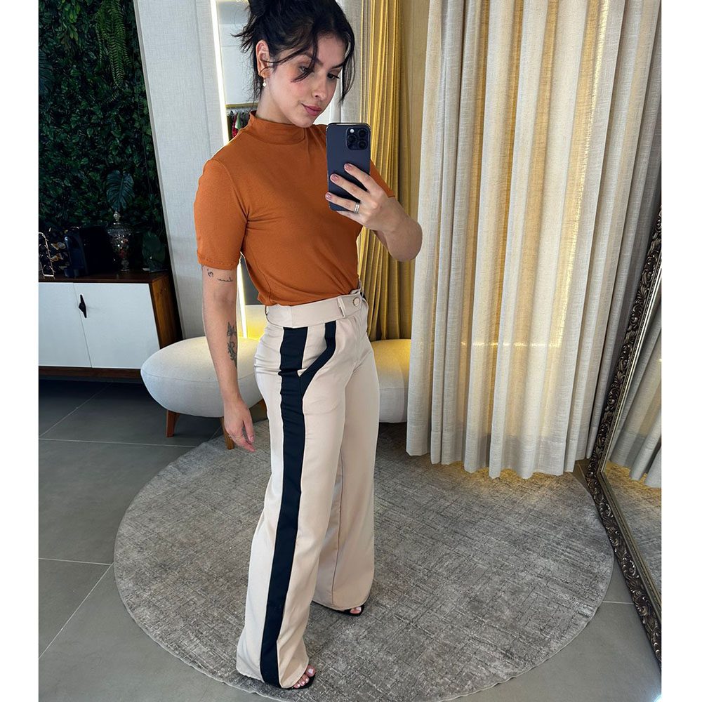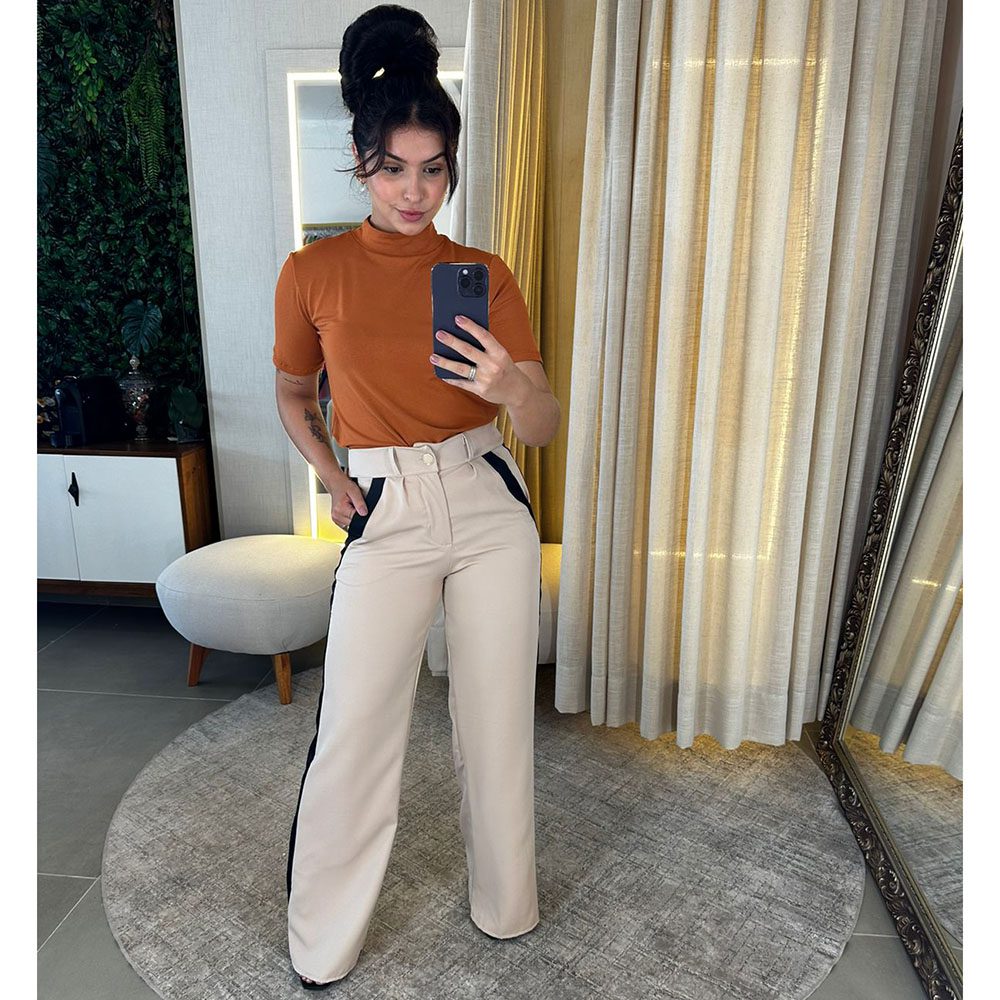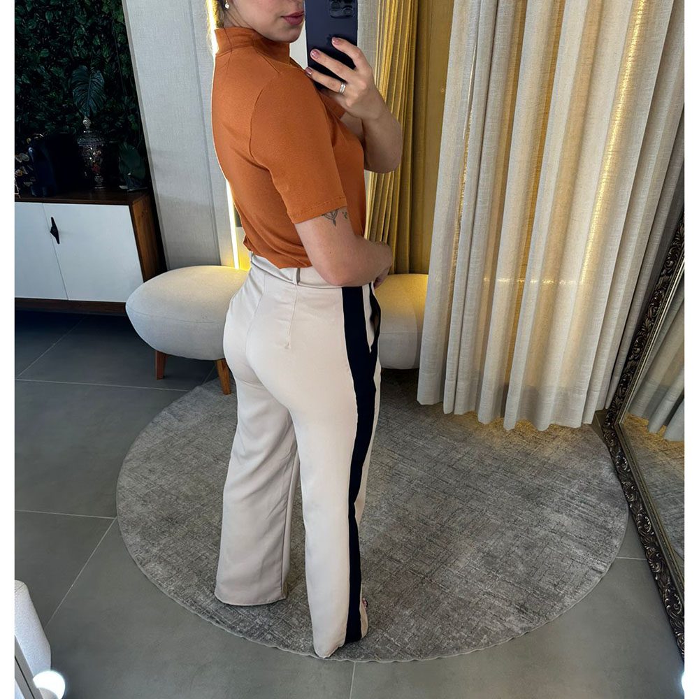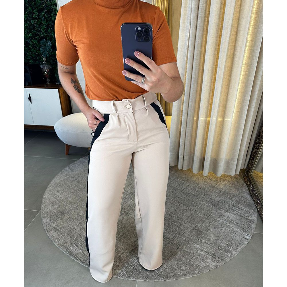 Calça Alfaiataria com dois bolsos laterais, cintura alta, abertura e fechamento em zíper com detalhe em Preto