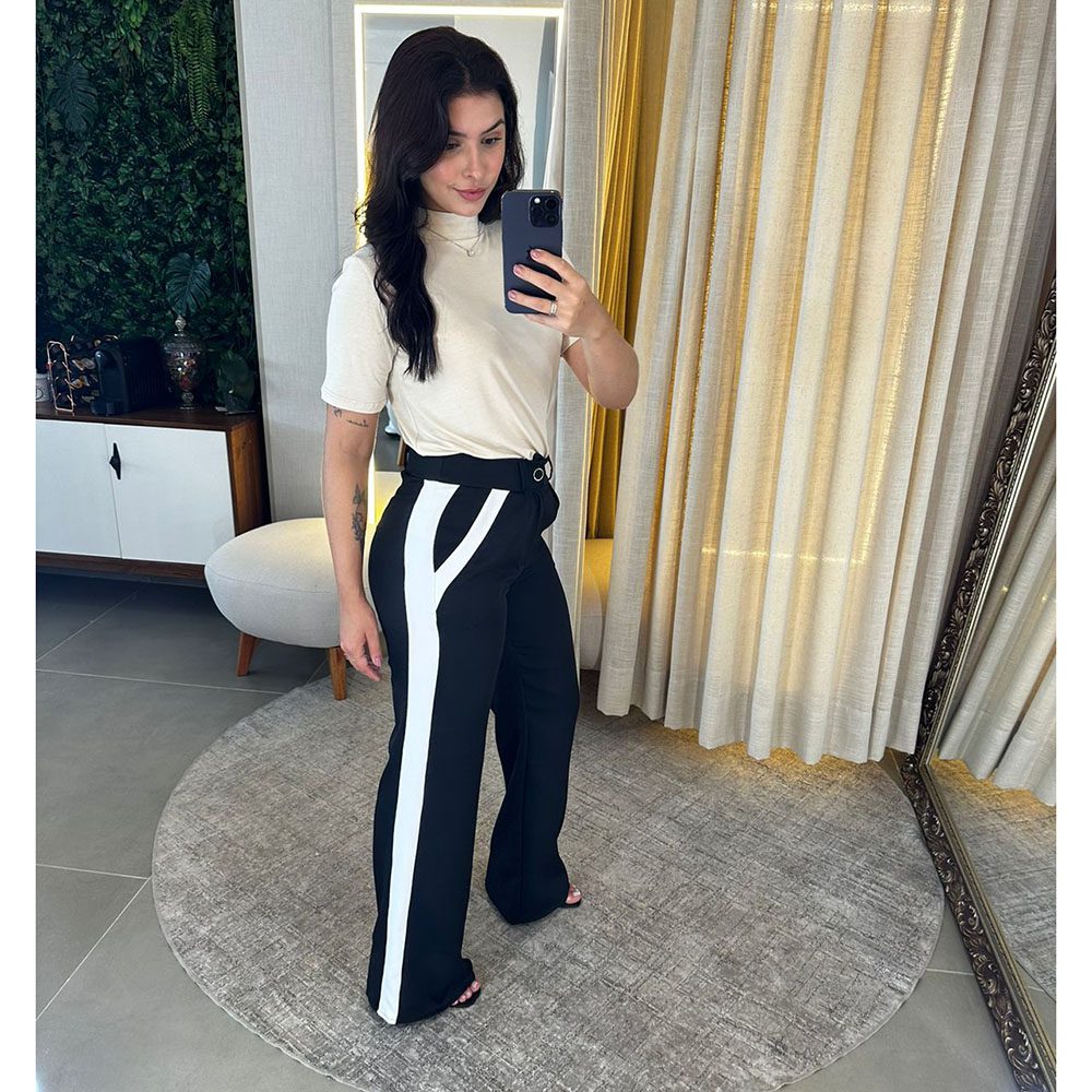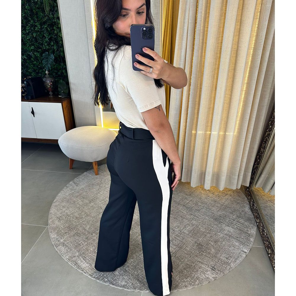Calça Alfaiataria com dois bolsos laterais, cintura alta, abertura e fechamento em zíper com detalhe na cor branco.