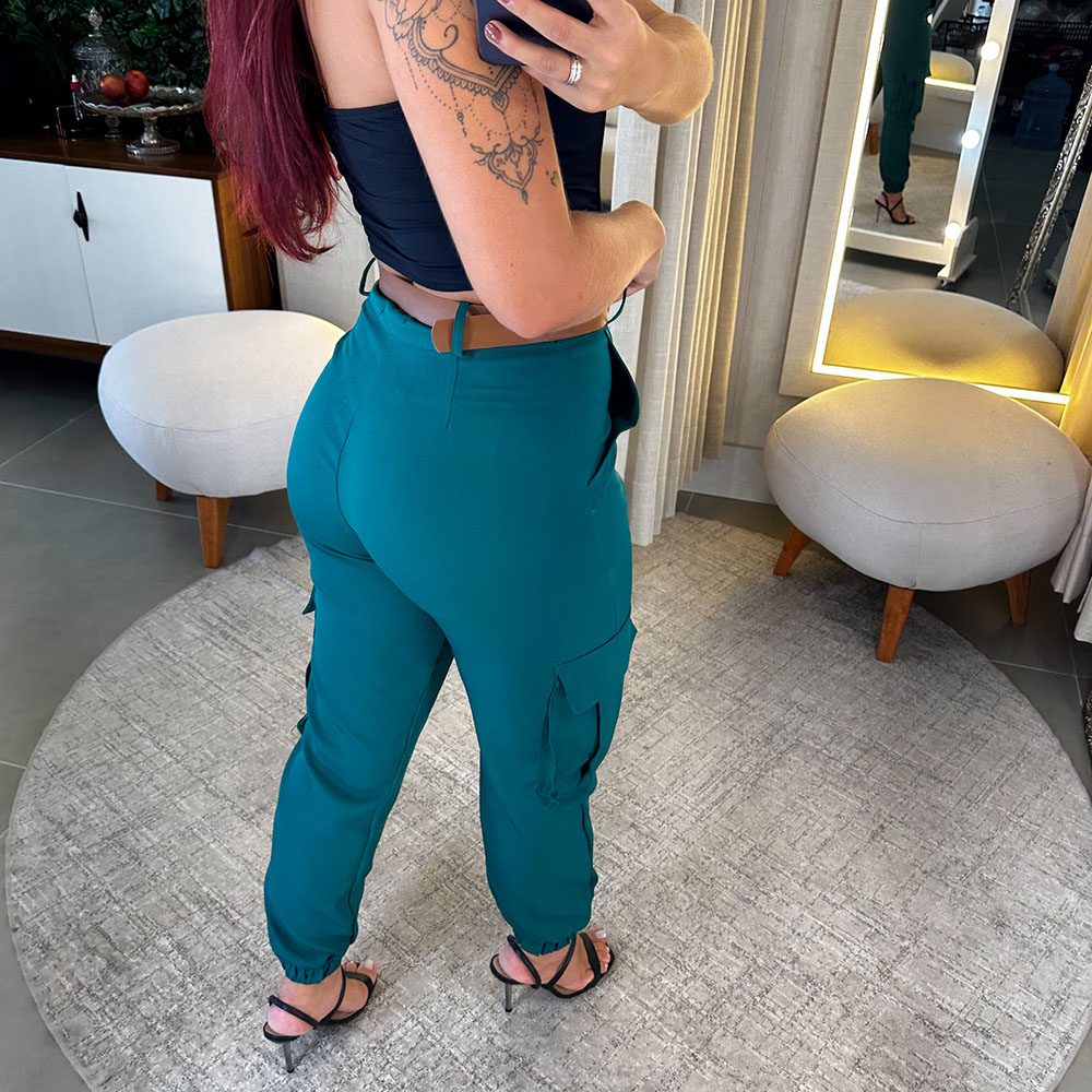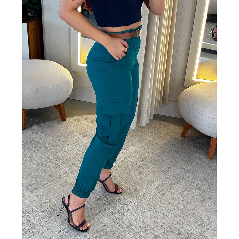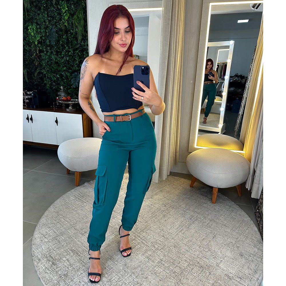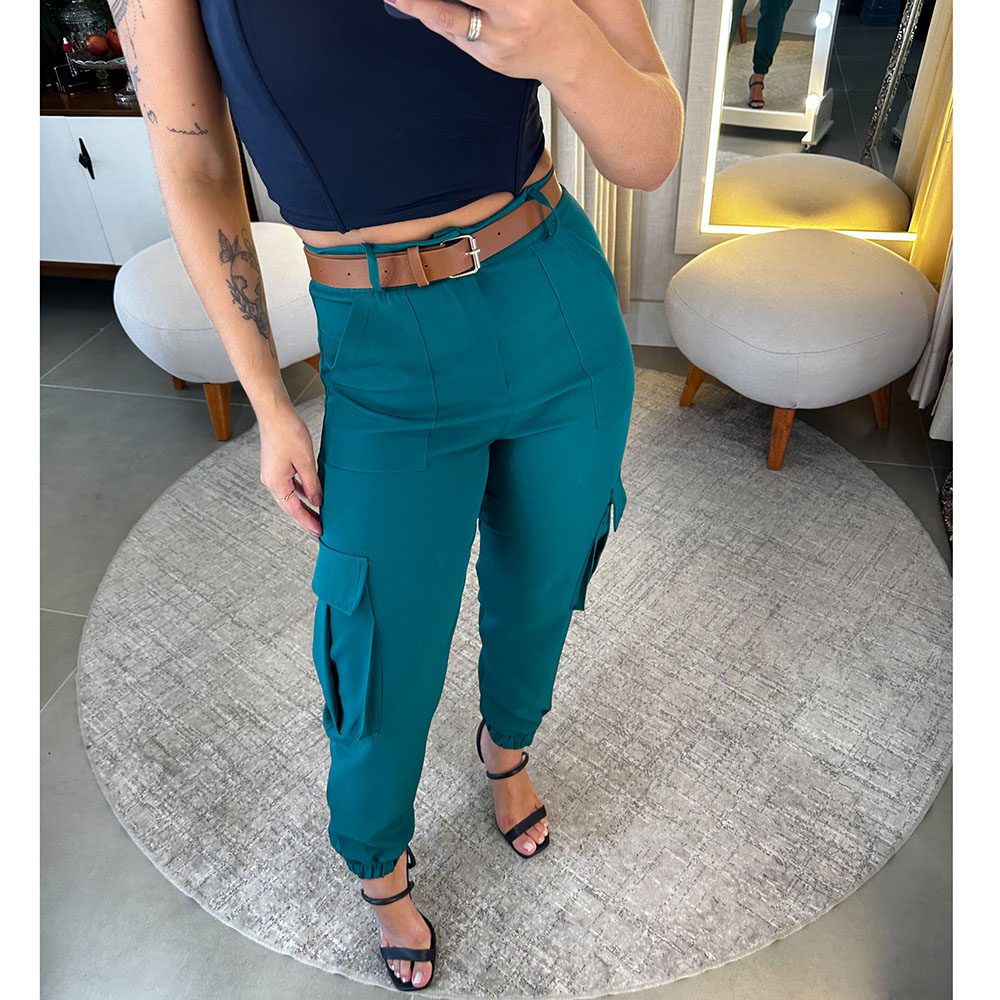 Calça Cargo em Alfaiataria jogger, com dois bolsos laterais, cintura alta, abertura e fechamento em zíper. Acompanha o cinto junto, cor marrom.