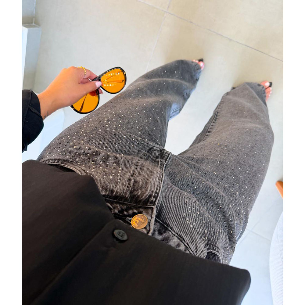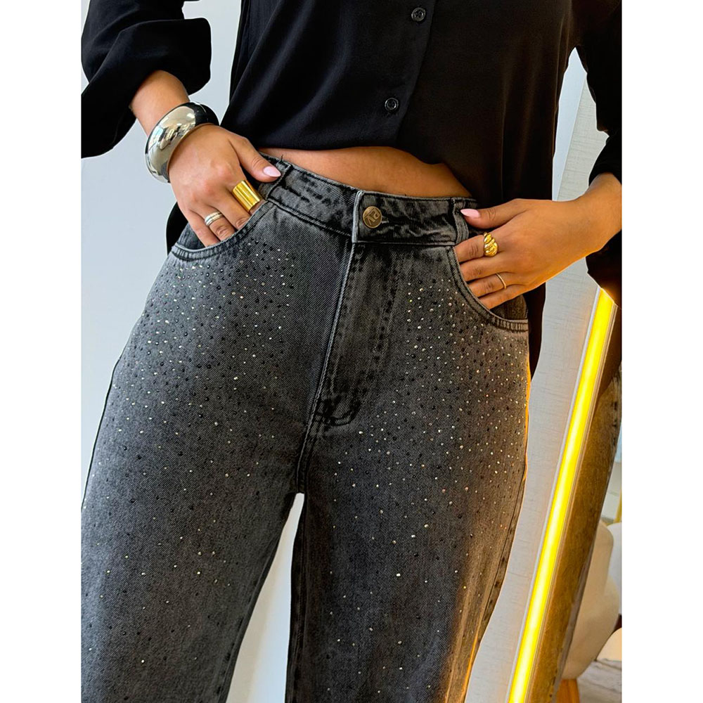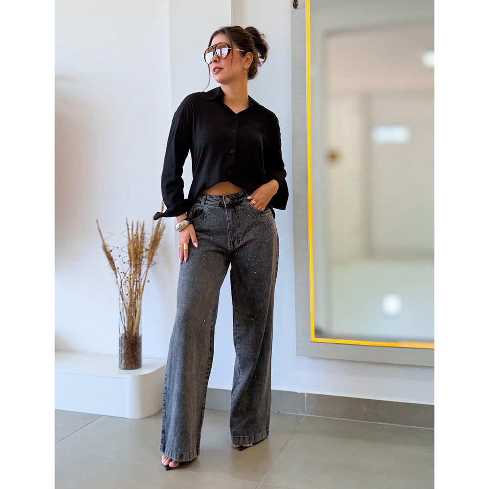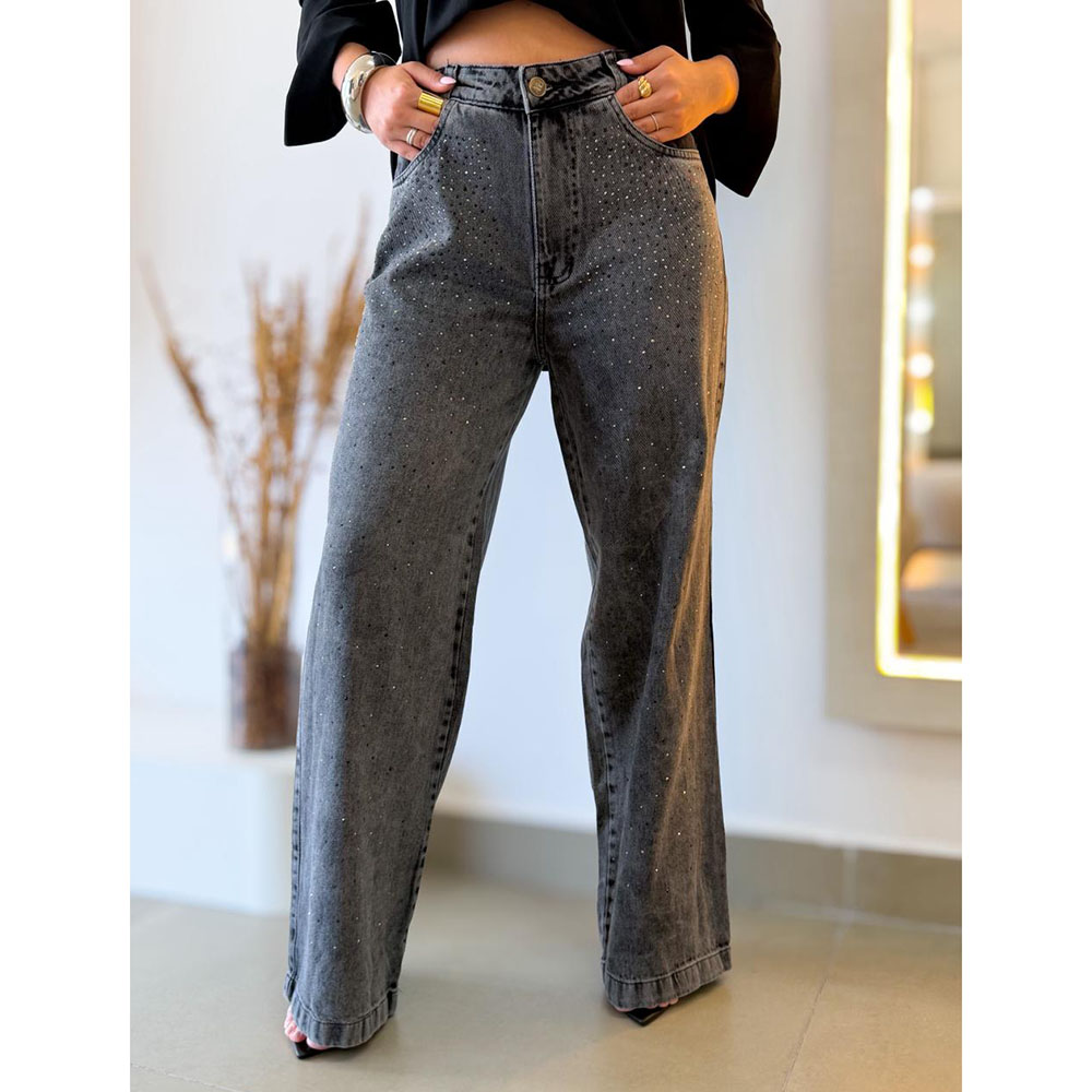 Calça jeans modelo pantalona, de cintura alta. Possui dois bolsos frontais e dois posteriores funcionais, garantindo praticidade no dia a dia. O destaque fica por conta das aplicações de strass na parte frontal, que trazem um charme extra e um toque de sofisticação. Conta ainda com fechamento por zíper e botão, proporcionando um ajuste seguro. A escolha ideal para elevar qualquer look com estilo e autenticidade.