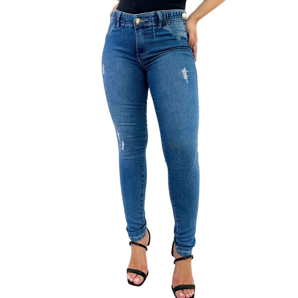 Calça Jeans Destroyed Feminina, modelo Skinny, Cintura alta com detalhe em botão, dois bolsos fake nas laterais, dois bolsos atrás, abertura e fechamento com zíper e botão.