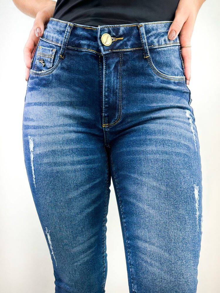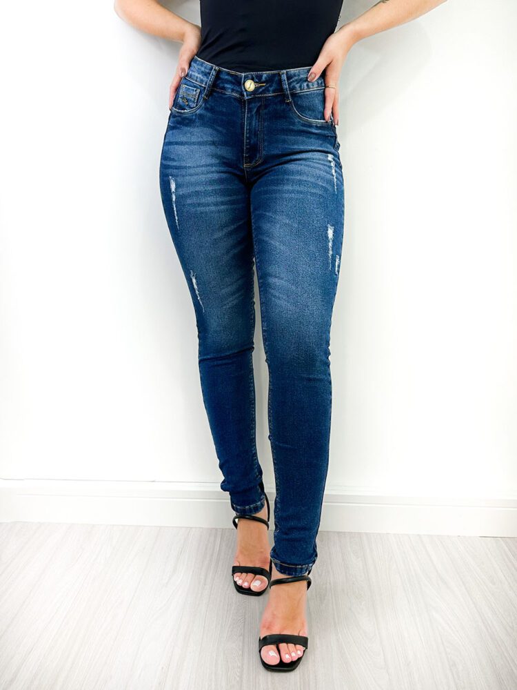 Calça Jeans Destroyed Feminina, modelo Skinny, lavagem escura, Cintura alta, dois bolsos fake nas laterais, dois bolsos atrás, abertura e fechamento com zíper e botão.