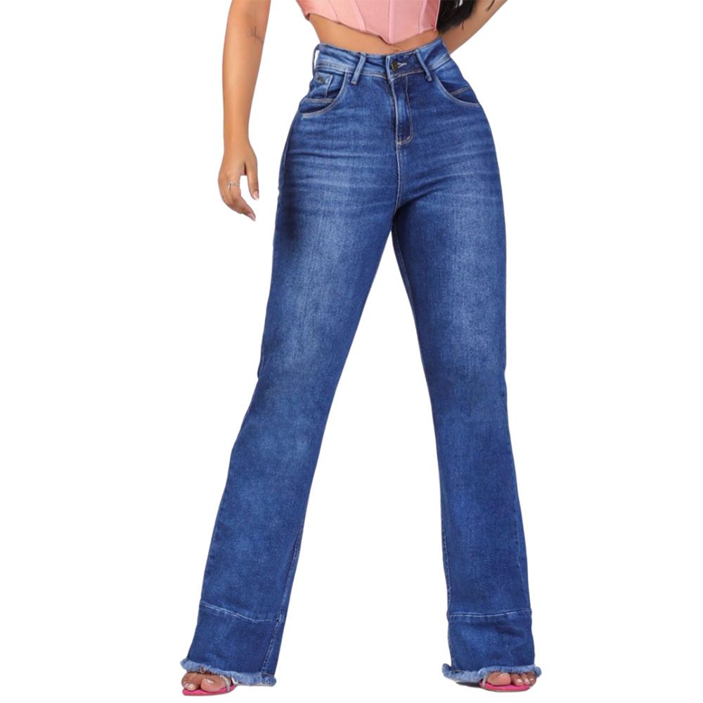 Calça Jeans Feminina, lavagem Escura, modelo corte reto, barra desfiada, Cintura alta, dois bolsos laterais, dois bolsos fake atrás, abertura e fechamento com zíper e botão.