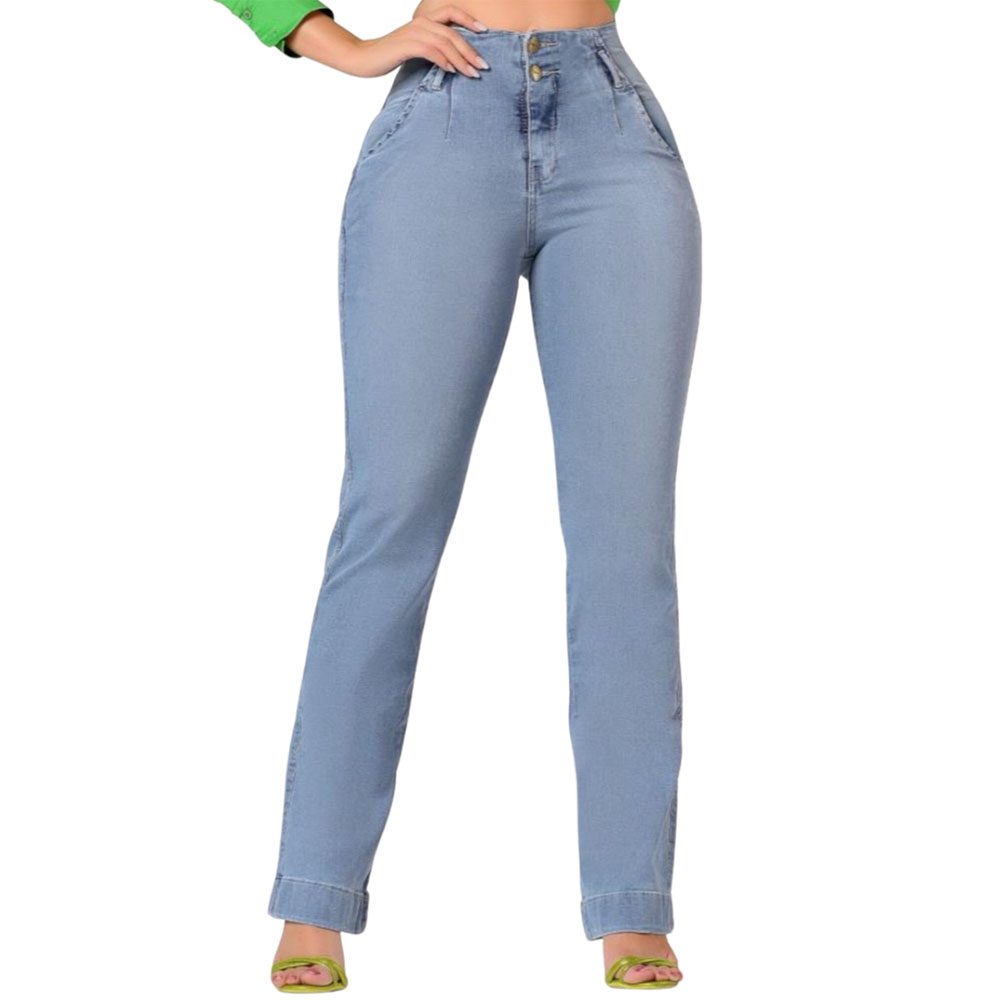 Calça Jeans Feminina, modelo corte reto, lavagem Clara, Cintura alta, dois bolsos fake nas laterais, dois bolsos atrás, abertura e fechamento com zíper e botões.