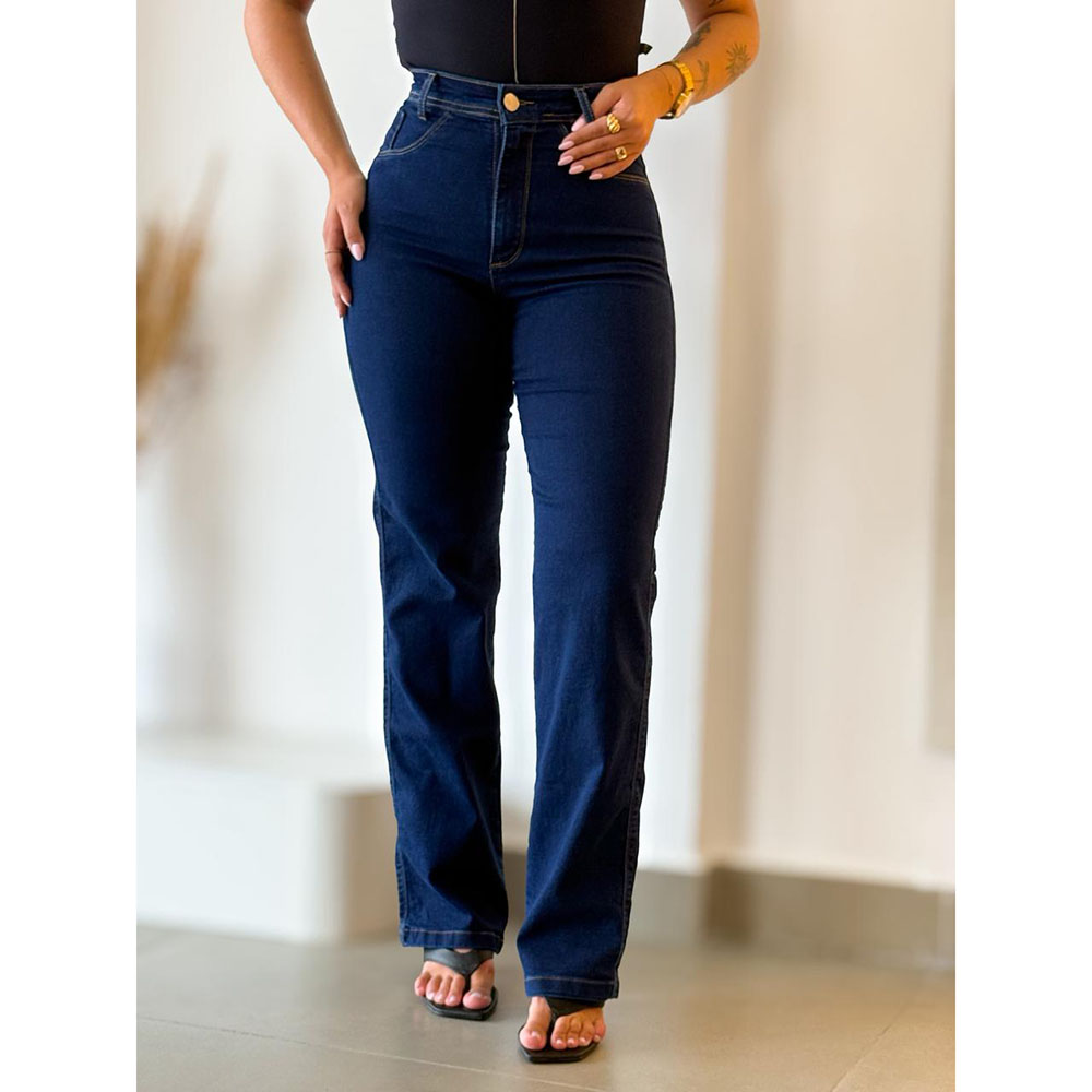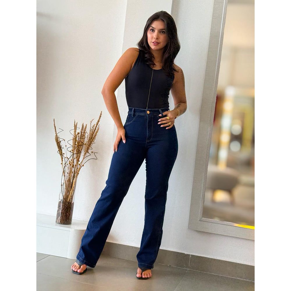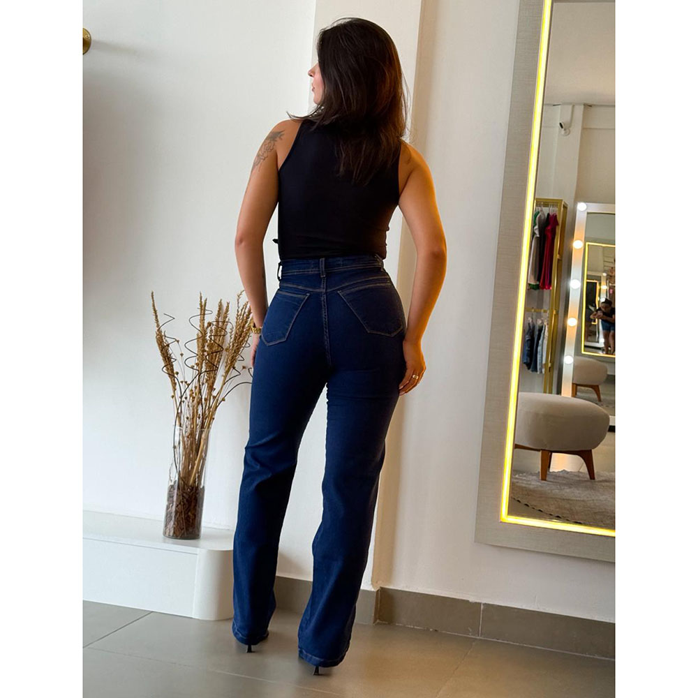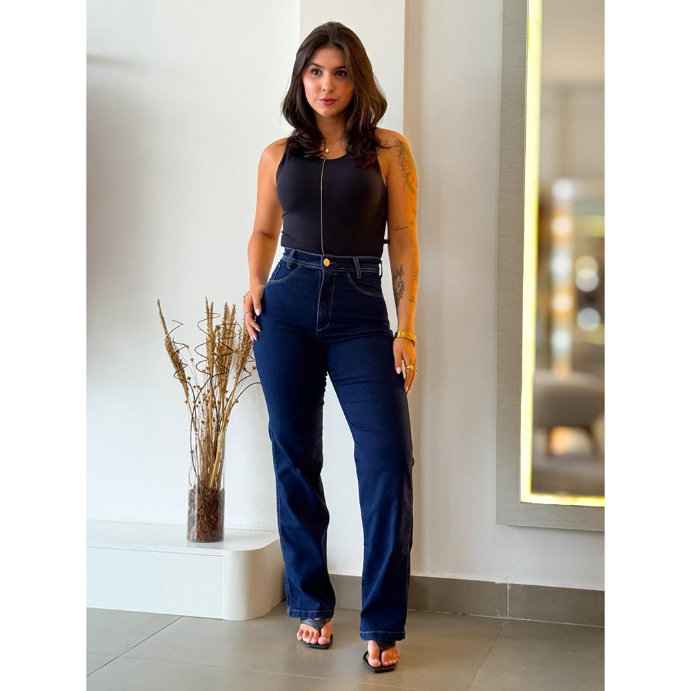 Calça Jeans modelo Pantalona, com elastano médio, cintura alta. Possui bolso fake na parte da frente e dois bolsos funcionais na parte de trás. Modelando o corpo e proporcionando conforto no uso diário.
