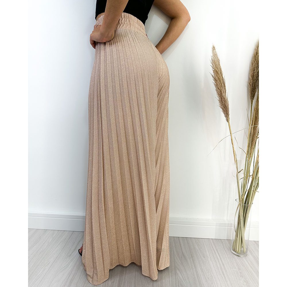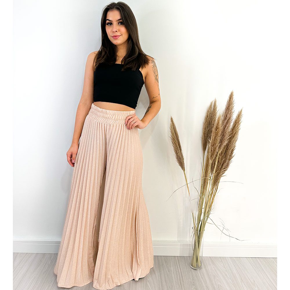 Calça Pantalona, plissada, em Lurex, cintura alta, com elástico na cintura.
