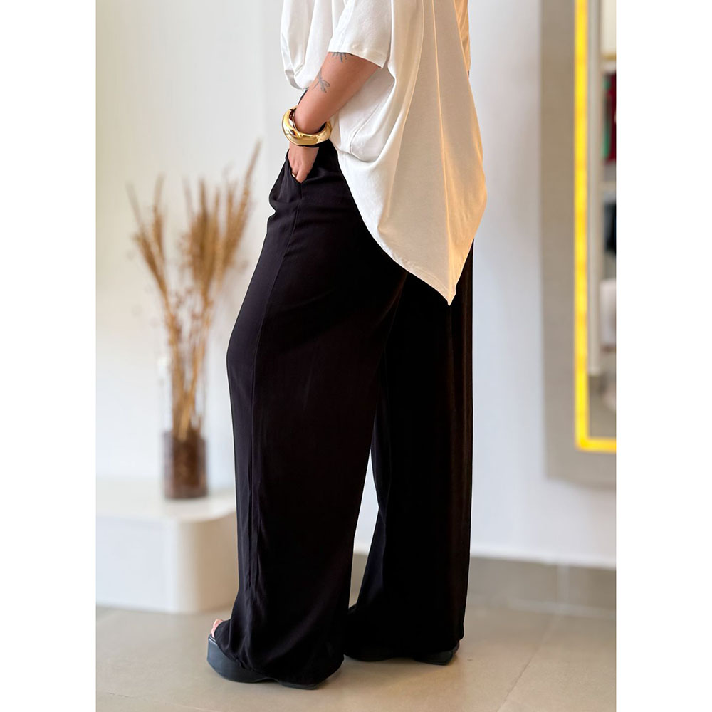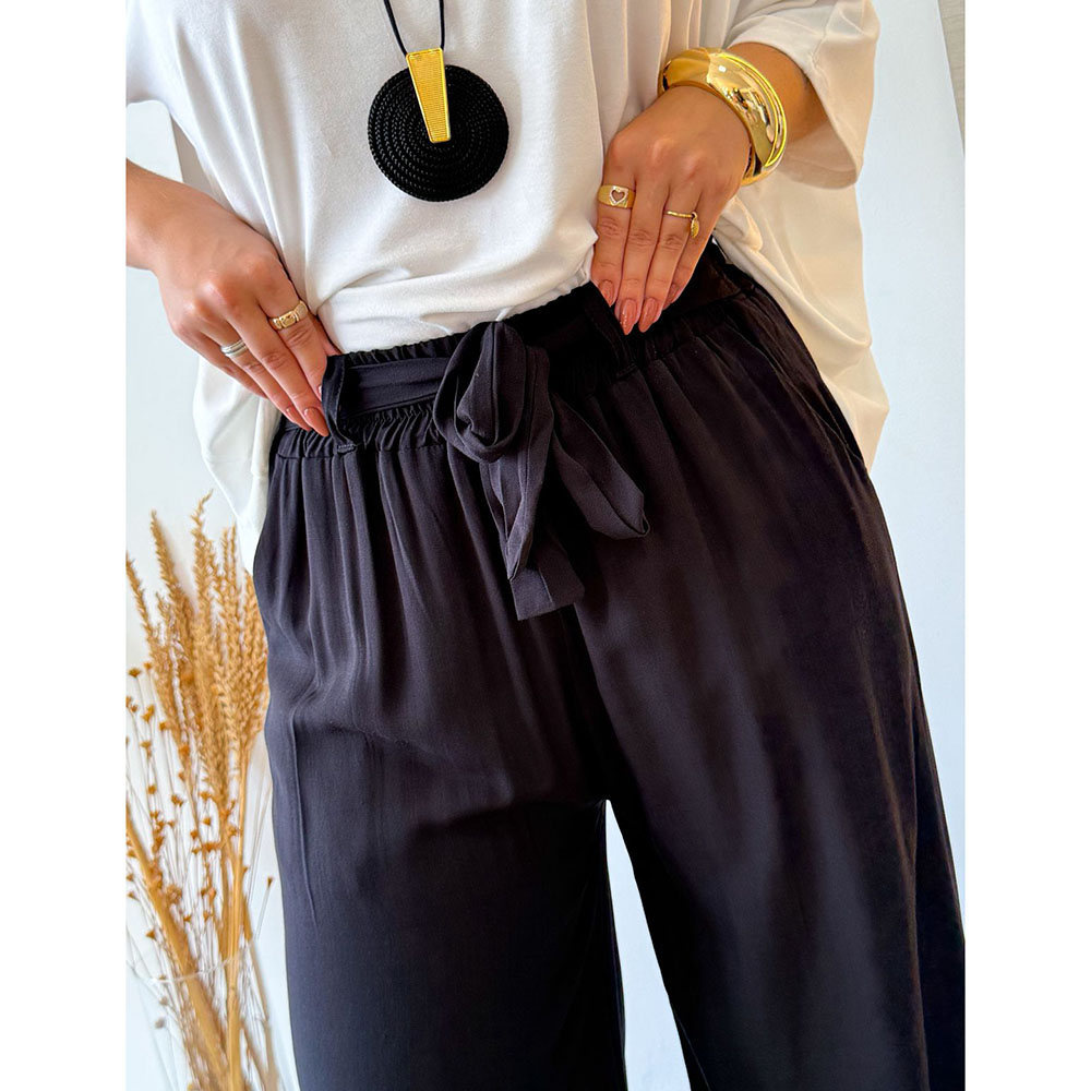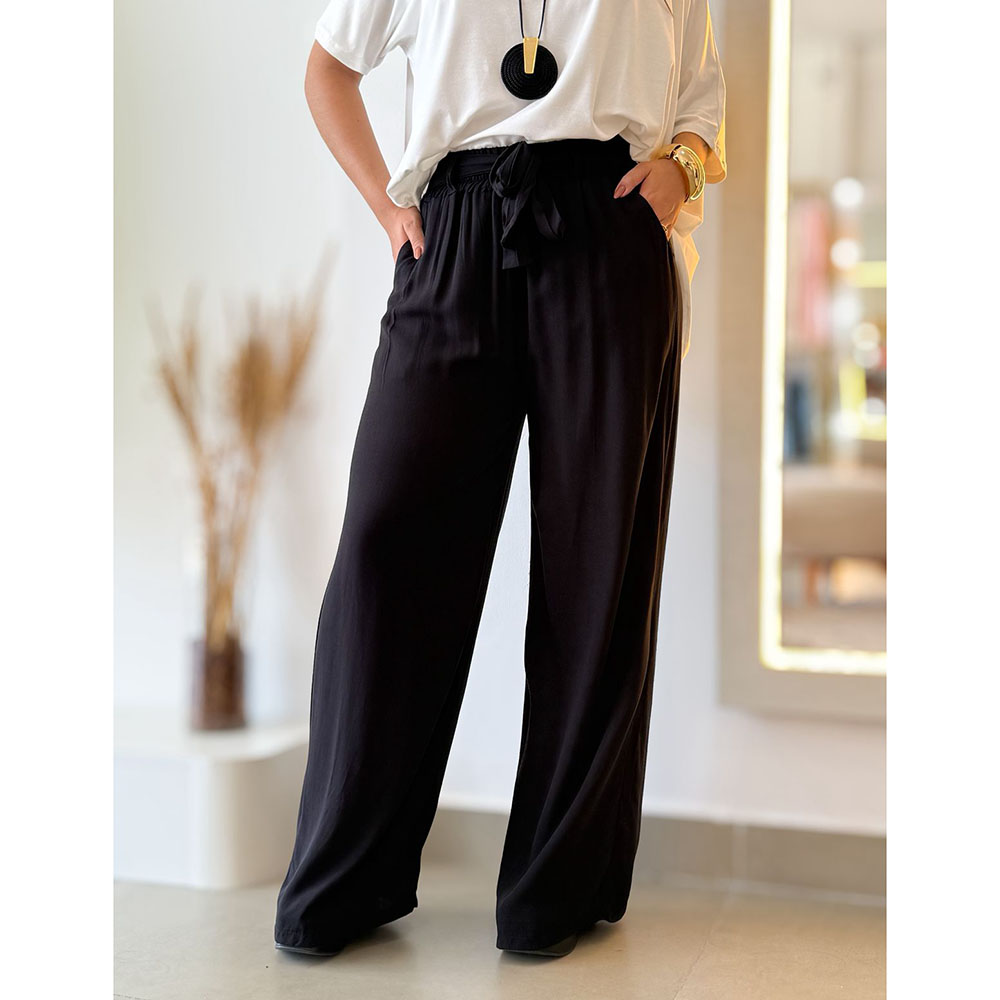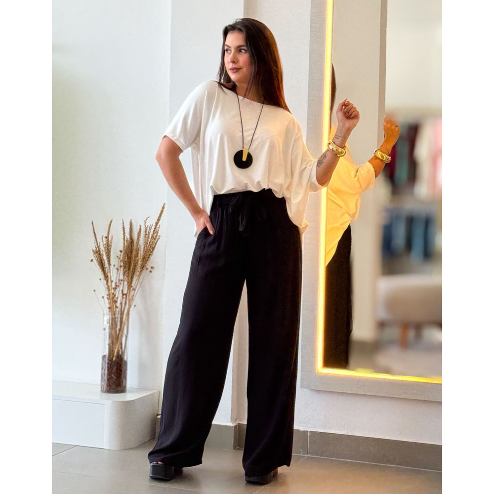 Calça pantalona em viscolinho, com cós elástico que proporciona ajuste confortável ao corpo. Possui detalhe de amarração fake, que acrescenta charme à peça, sendo o modelo ideal para diversas ocasiões.