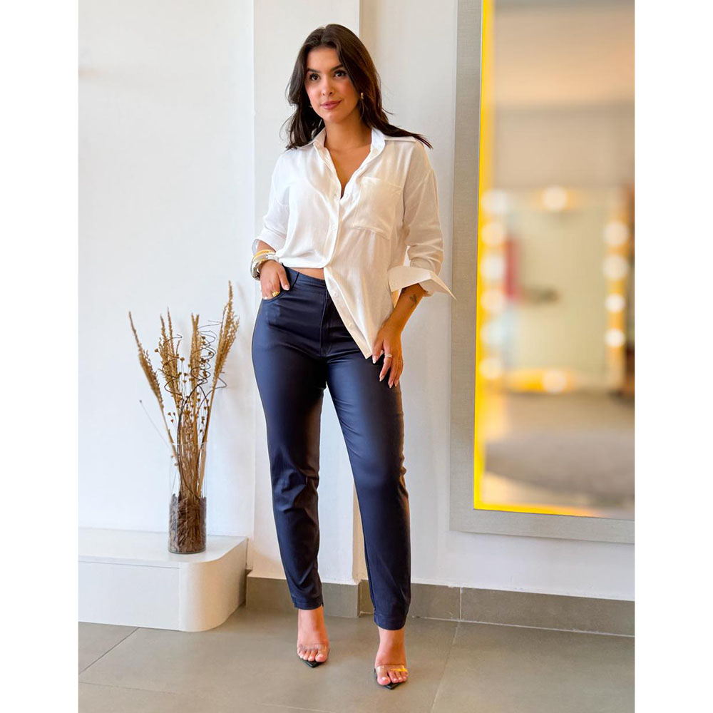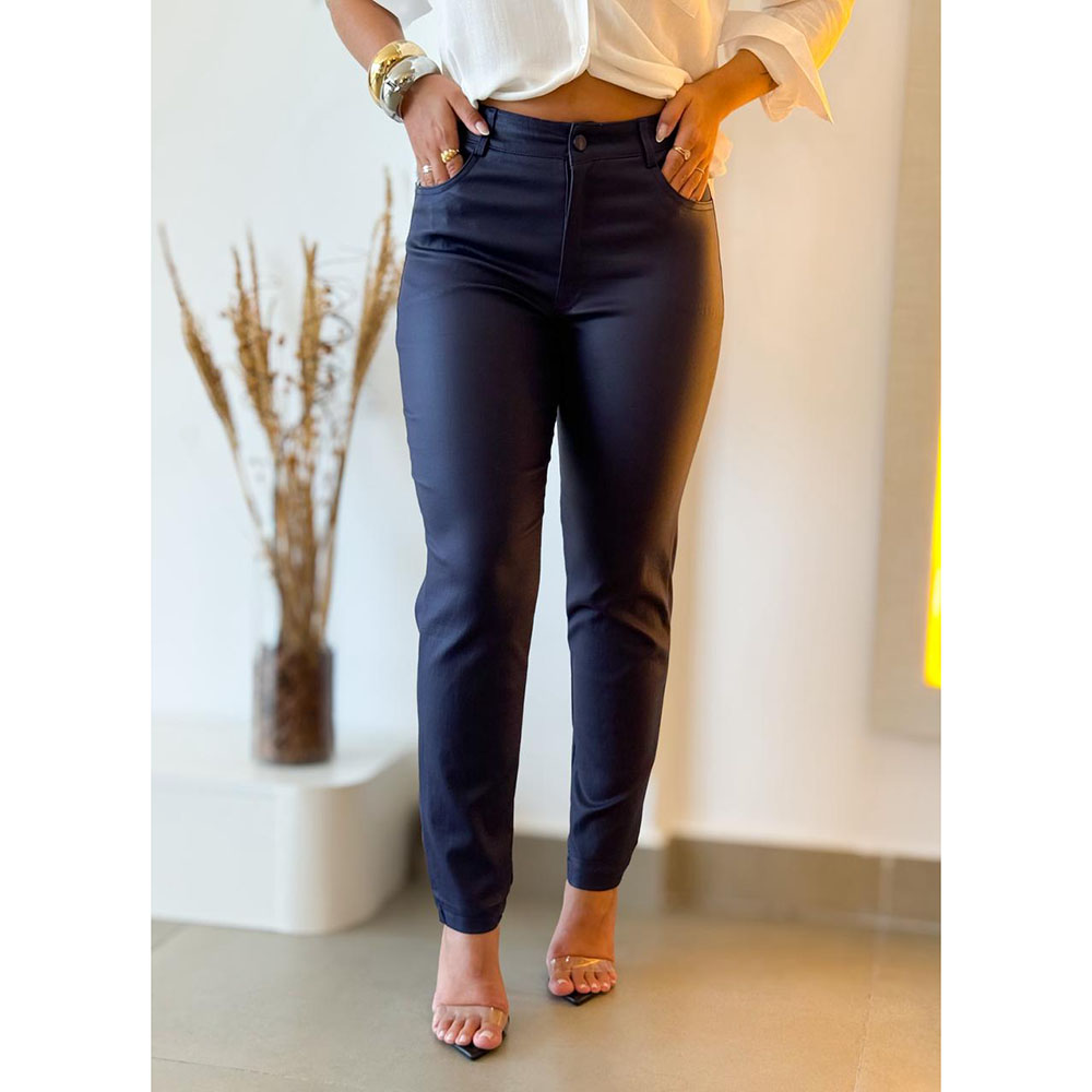 Calça resinada modelo skinny, com leve brilho que traz um toque moderno ao visual. Possui fechamento por zíper e botão, além de dois bolsos na parte da frente e atrás. Proporciona liberdade de movimento e um caimento que se ajusta perfeitamente ao corpo, unindo estilo e praticidade para diversas ocasiões.