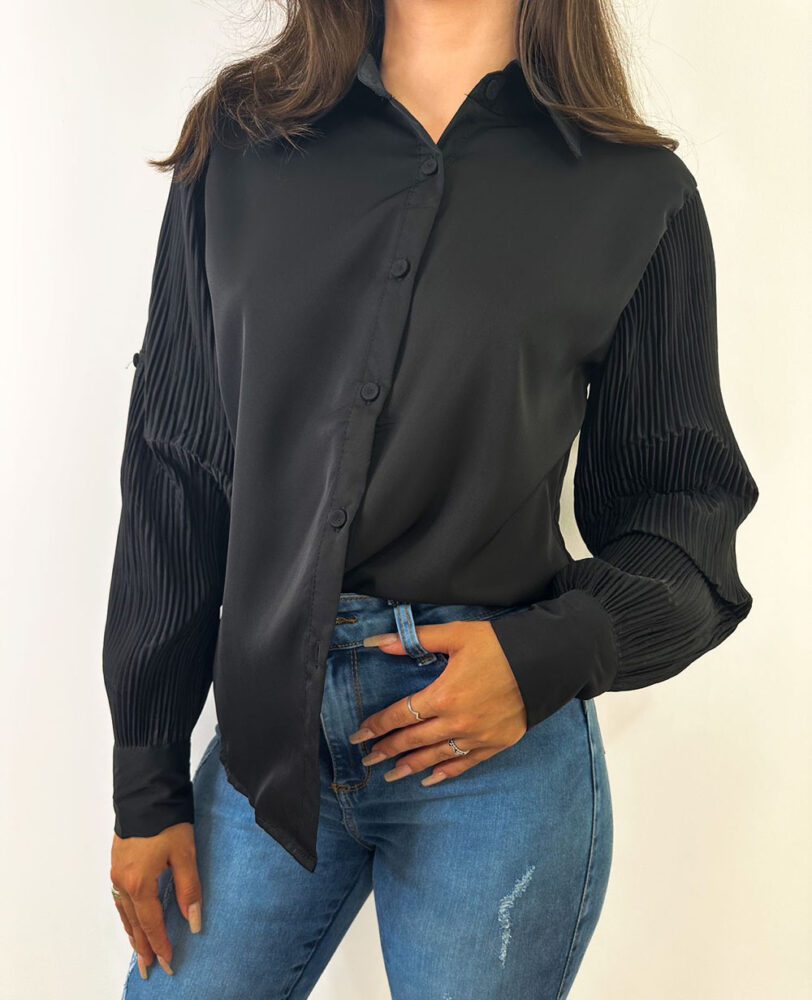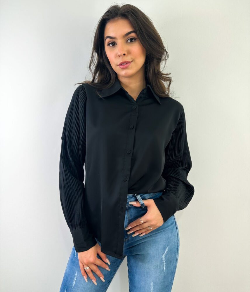 Camisa social feminina, manga longa plissada, abertura e fechamento com botões.
