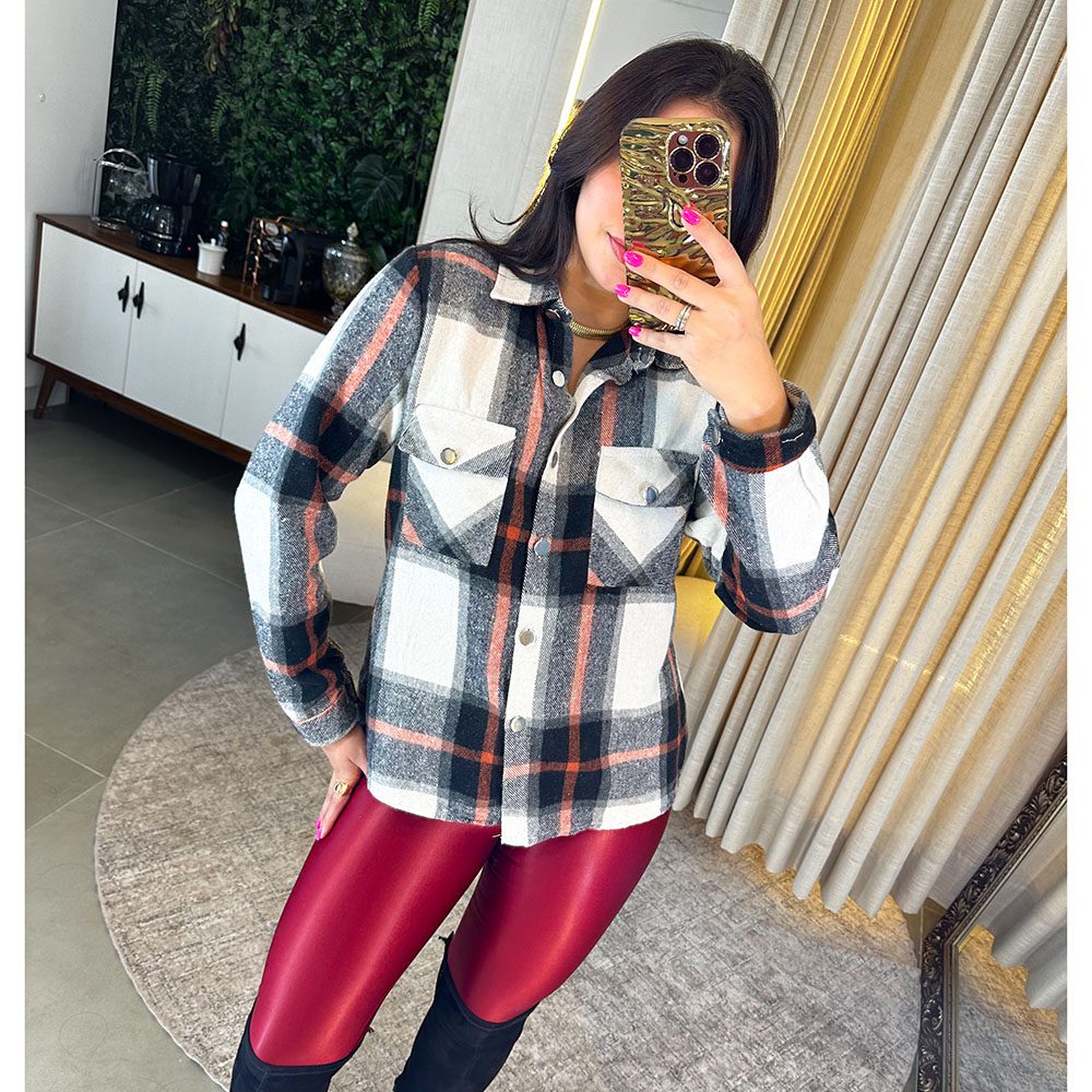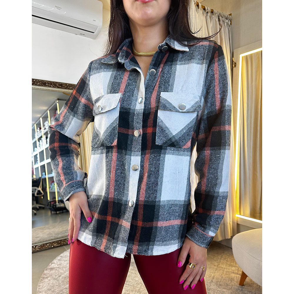 Camisa flanelada com botões e dois bolsos na parte da frente.