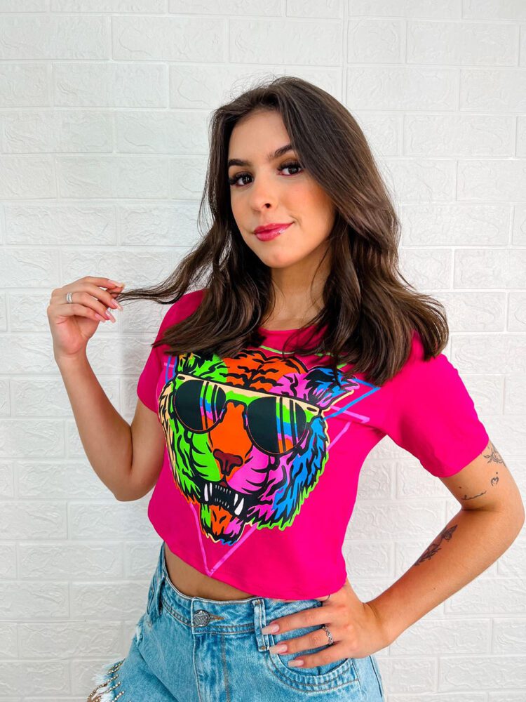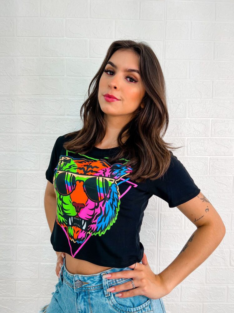 Camiseta cropped Feminina, manga curta, gola redonda, com estampa de Tigre Colorido.