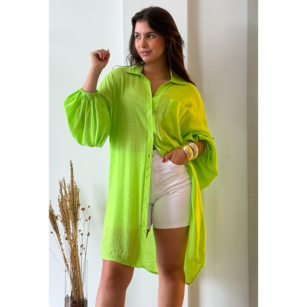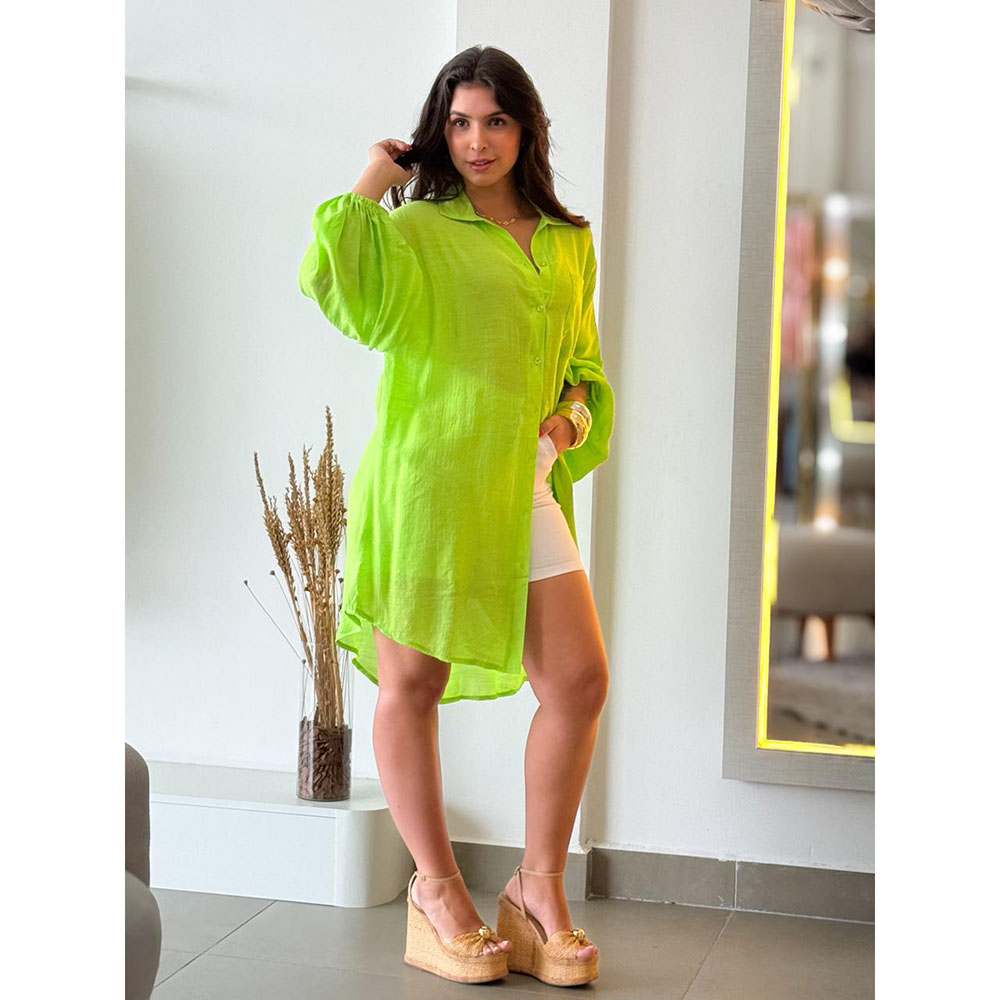 Chemise longa de modelagem elegante com toque delicado e leve transparência, com botões no busto que trazem praticidade e estilo. Possui bolso no busto, acrescentando funcionalidade ao design. As mangas detalhadas com punho valorizam o acabamento da peça, garantindo um visual moderno e sofisticado, ideal para diversas ocasiões.