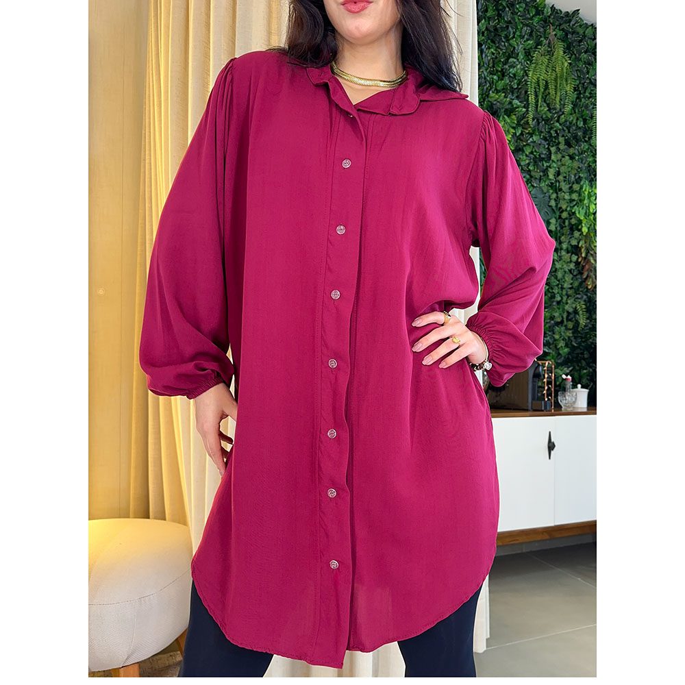 Chemise em tecido Viscolinho, Manga Longa, com elástico no punho, abertura e fechamento com botões.