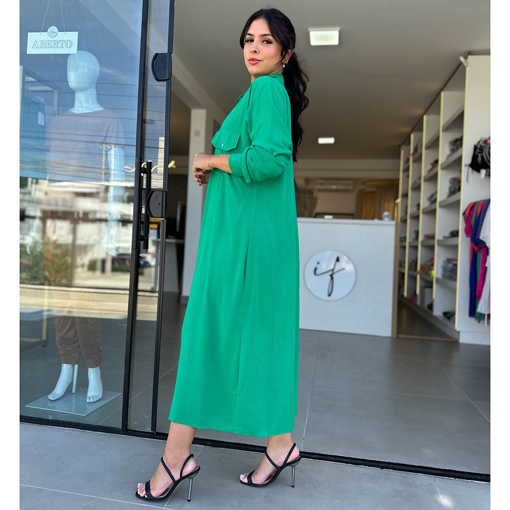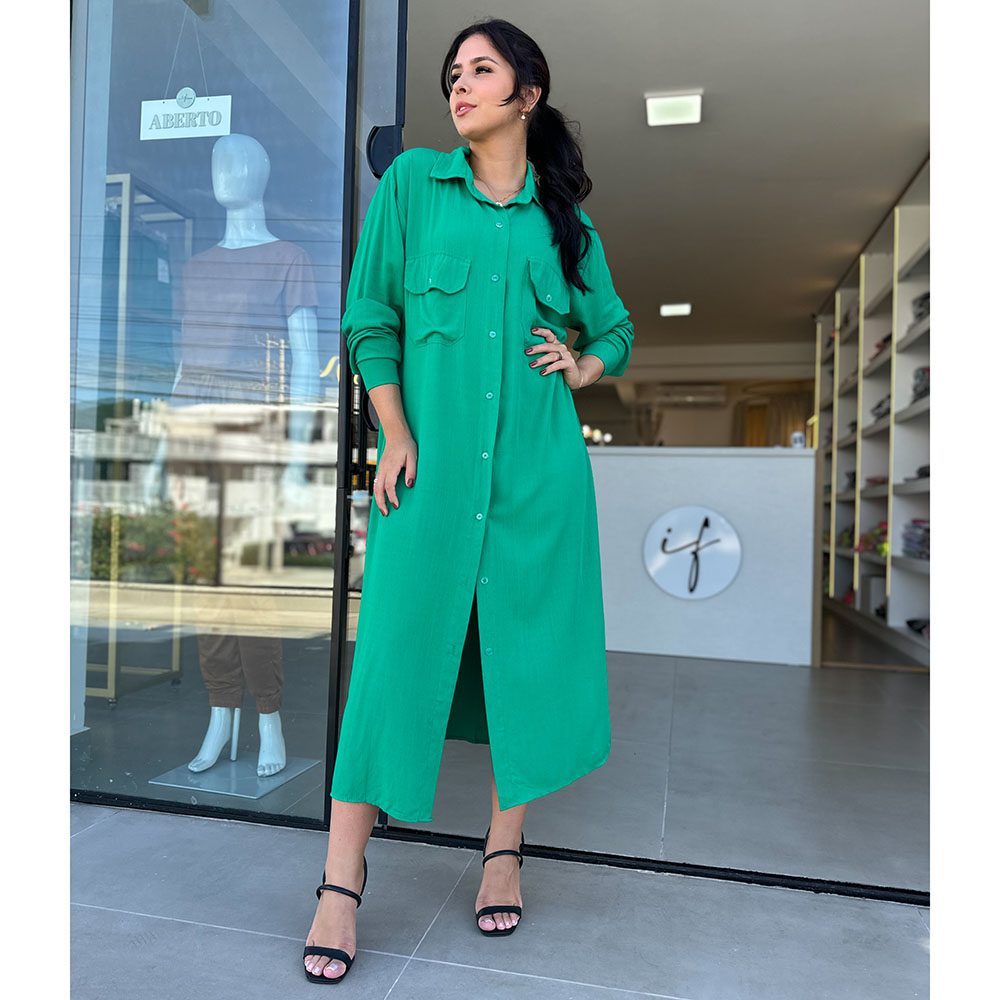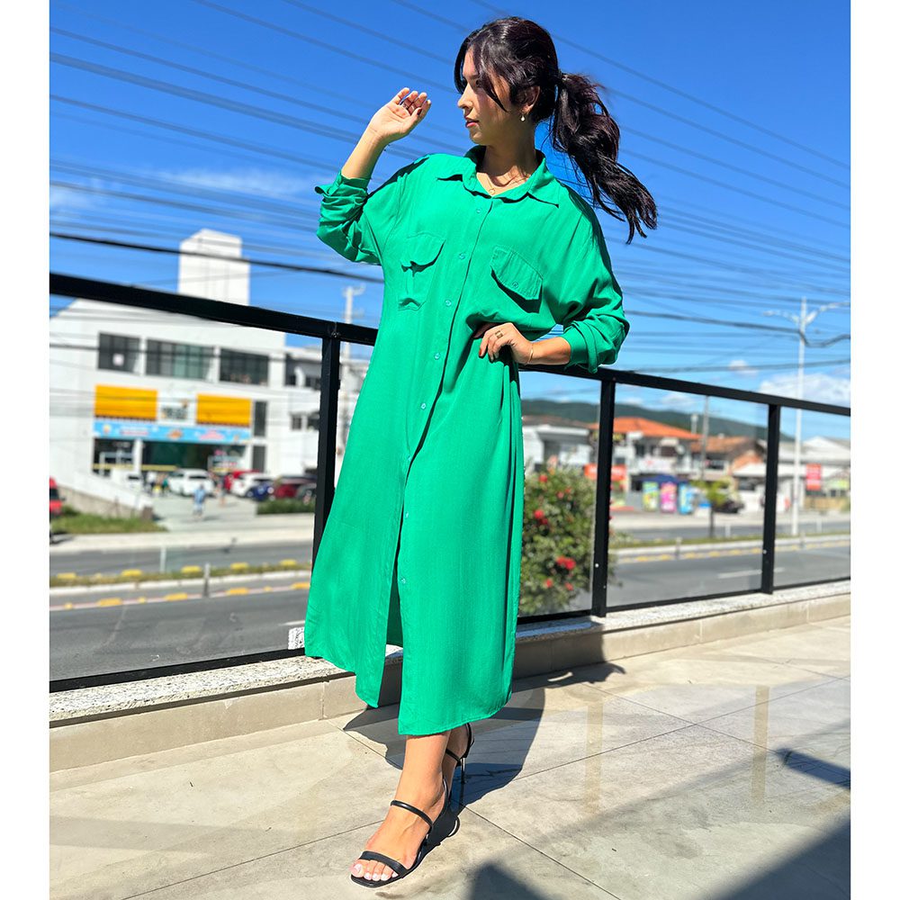 Chemise em tecido Viscolinho, Manga Longa, com abertura e fechamento em botões.