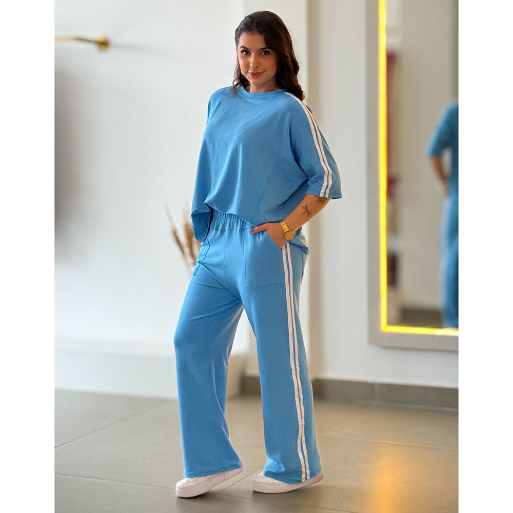 Conjunto com listra confeccionado em tecido moletinho, blusa possui gola redonda com manga até o cotovelo, proporcionando um caimento leve e confortável. Calça com elástico na cintura garante ajuste perfeito, dois bolsos na parte da frente e atrás. Um modelo confortável e estiloso, perfeito para usar como look casual no dia a dia.