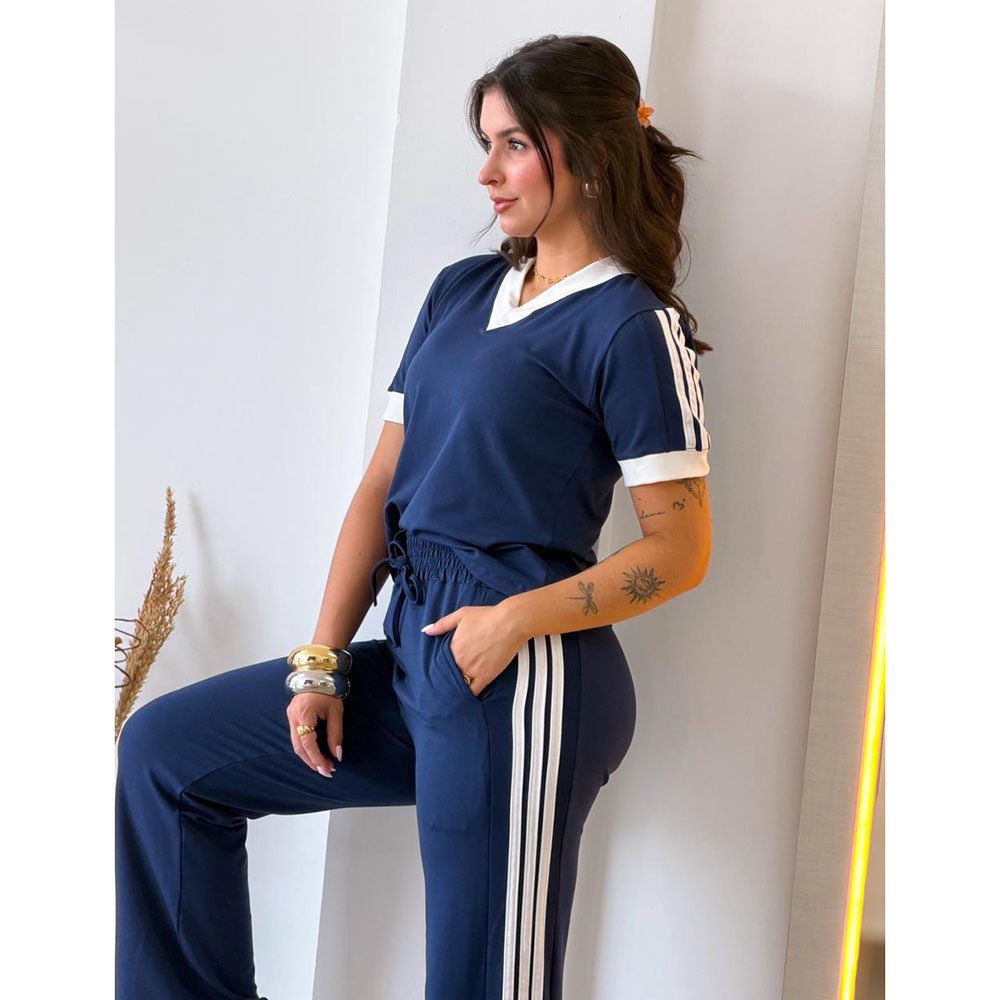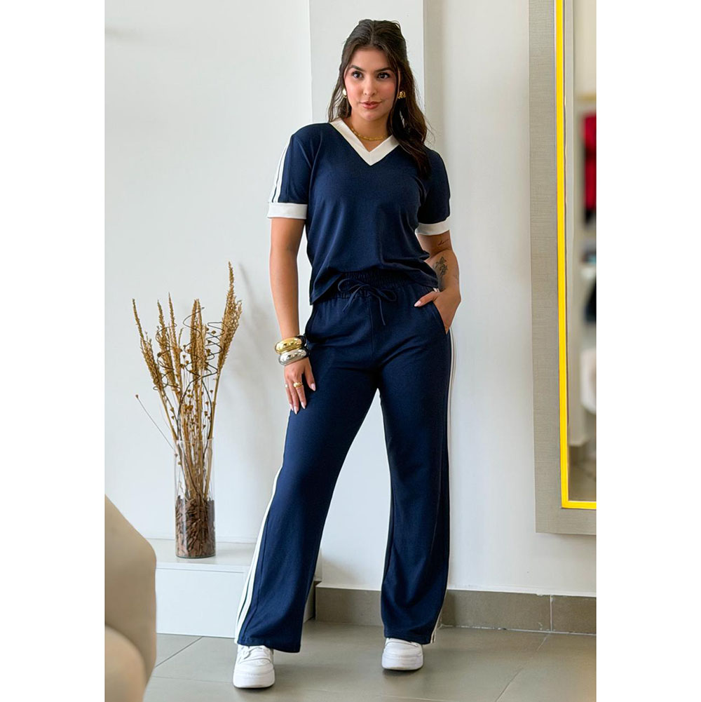 Conjunto em tecido moletinho, composto por blusa de manga curta com decote em V. Possui detalhe branco na gola e nas mangas, trazendo um charme extra ao visual. Calça com modelagem reta e conta com listras laterais que ajudam a valorizar a silhueta, deixando o look mais moderno. Possui elástico no cós, dois bolsos frontais e detalhe de amarração frontal fake. O conjunto ideal para quem busca conforto e estilo no dia a dia.