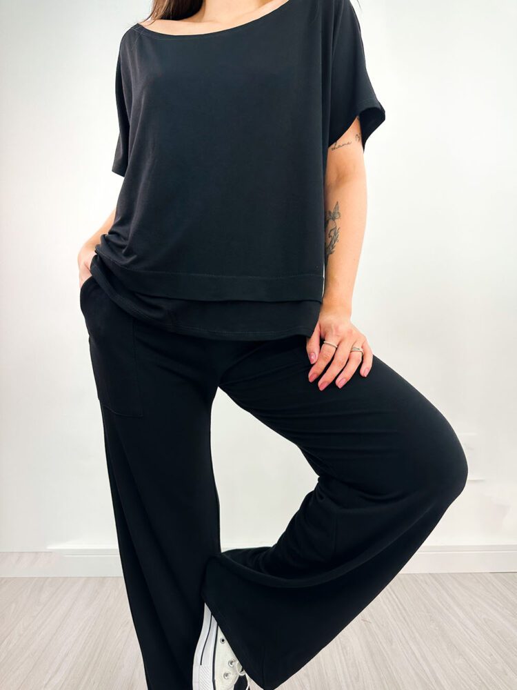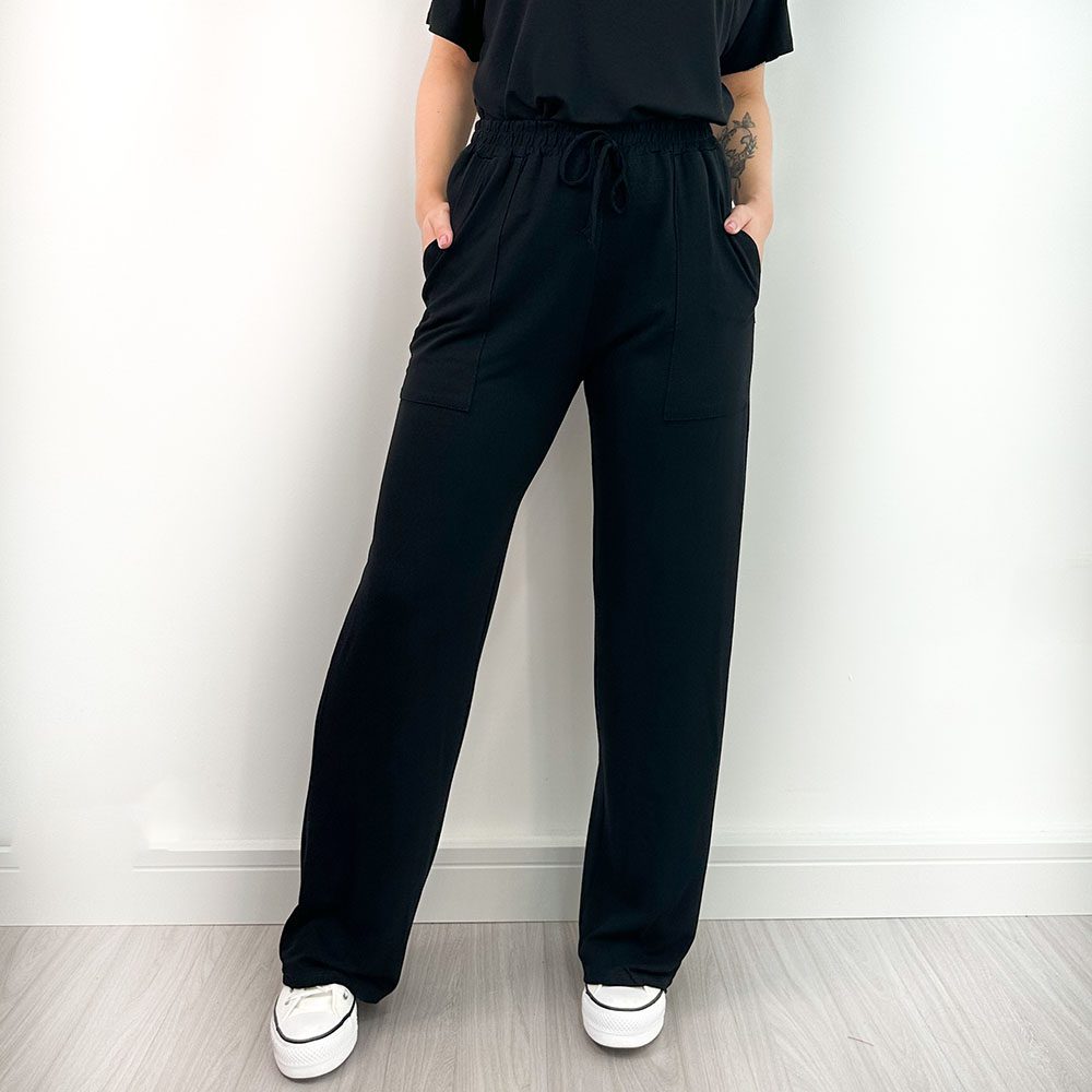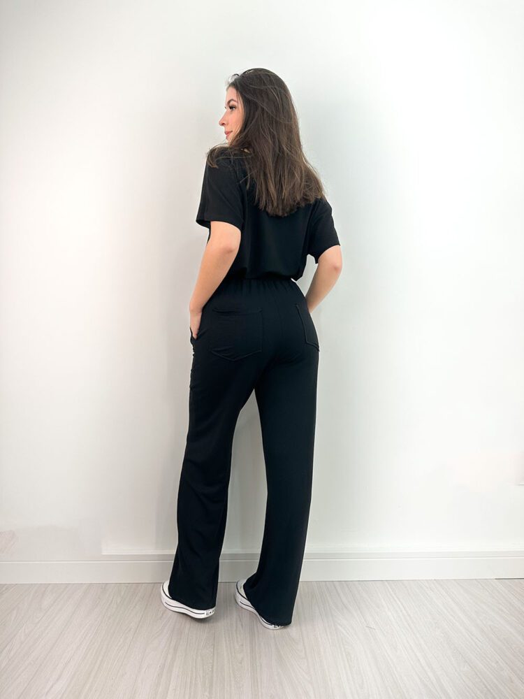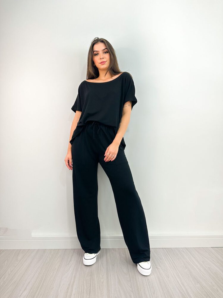 Conjunto em Moletinho, calça e blusa manga curta, gola canoa. Com detalhe na barra.