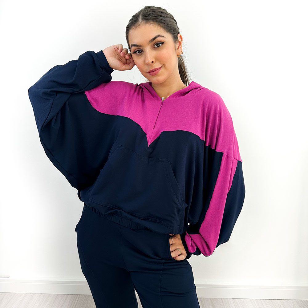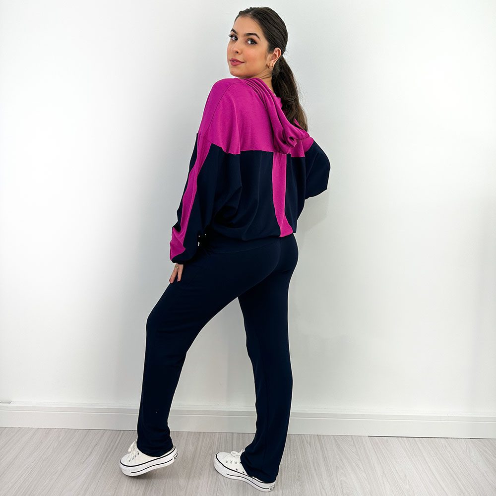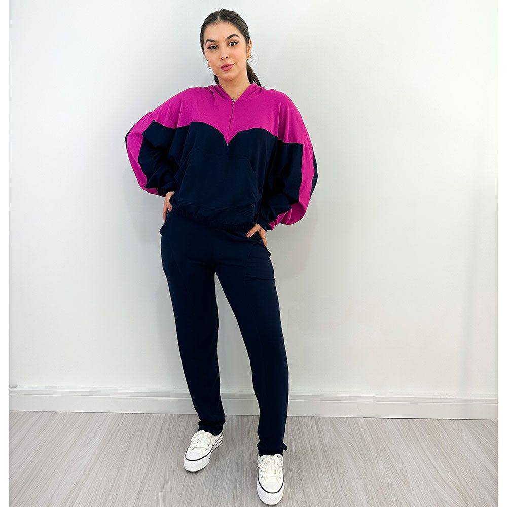 O conjunto comfy de moletinho é a melhor escolha para looks confortáveis e estilosos. Composto por Calça corte reto com dois bolsos na frente, e detalhes em costura. O cós tem elástico na cintura. O casaco é com capuz, com detalhe em zíper na frente e com bolso canguru, e com elástico na cintura.
