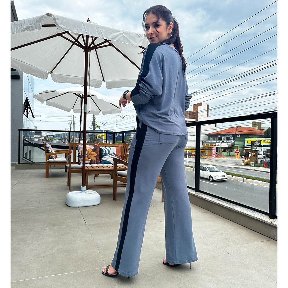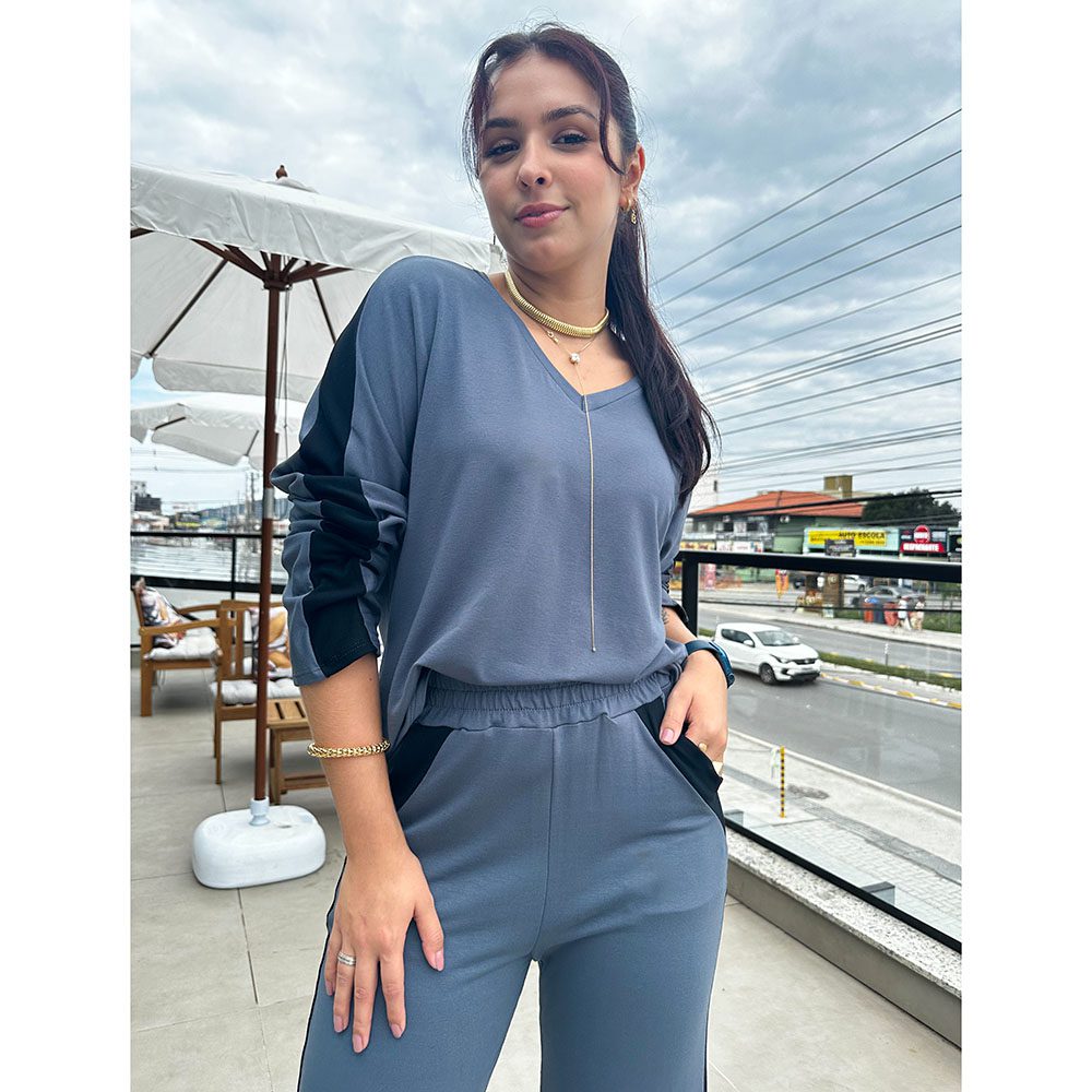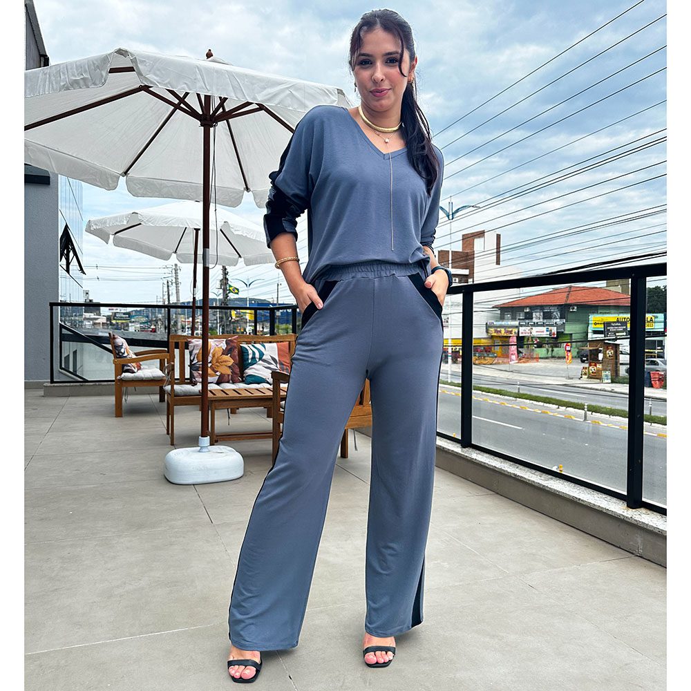 O conjunto comfy de moletinho é a melhor escolha para looks confortáveis e estilosos. Com calça corte reto, com dois bolsos na parte da frete e trás. Blusa manga cumprida, com decote em V.