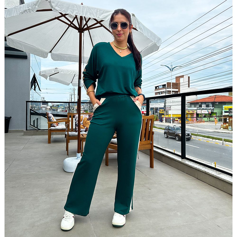 O conjunto comfy de moletinho é a melhor escolha para looks confortáveis e estilosos. Com calça corte reto, com dois bolsos na parte da frete e trás. Blusa manga cumprida, com decote em V.