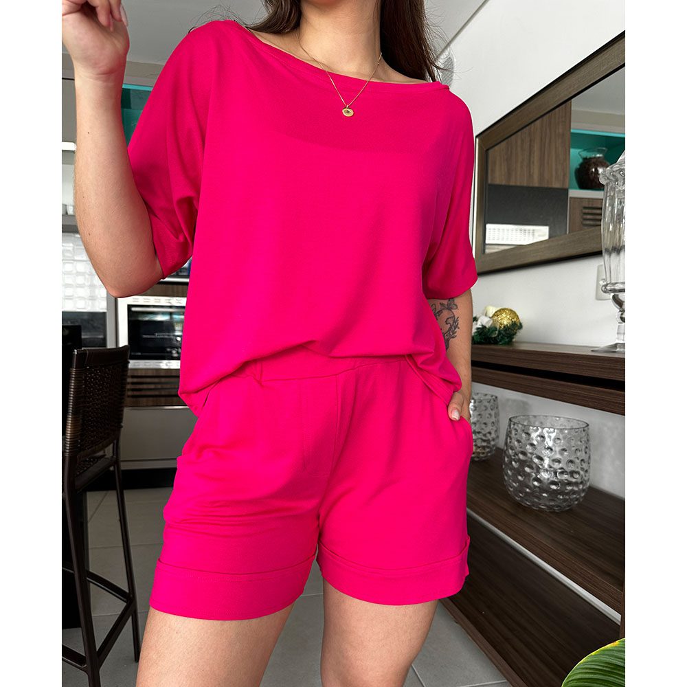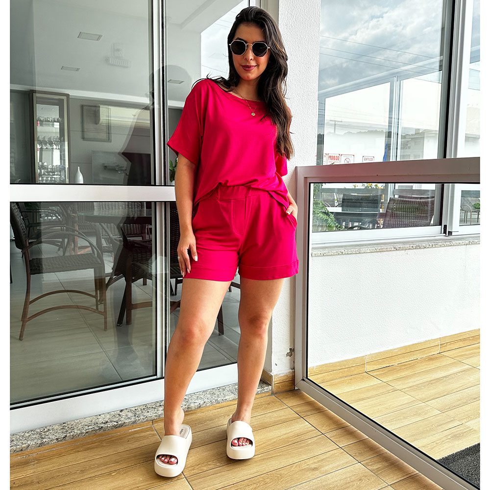 Conjunto com short e blusa em moletinho. Short com dois bolsos na frente, elástico na cintura e detalhes na barra. Blusa corte gola canoa, super confortável.