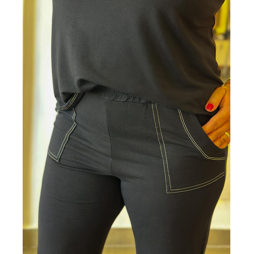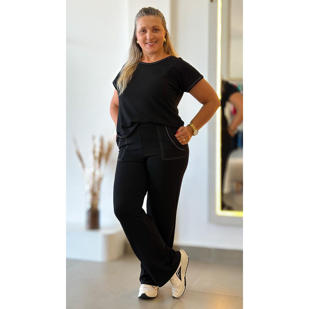 Conjunto em tecido moletinho, composto por blusa destacada por pespontos nas mangas, barra e na gola. Calça modelo pantalona corte reto, possui elástico no cós, dois bolsos na frente e detalhe de pespontos no bolso. O conjunto perfeito para quem busca conforto e estilo.
