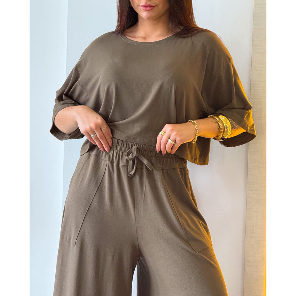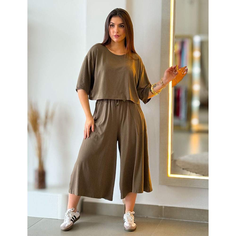 Conjunto em viscolycra, blusa com manga e no comprimento ideal. Calça pantacourt com elástico na cintura garante ajuste perfeito, dois bolsos na parte da frente. Um modelo confortável e estiloso, perfeito para usar como look casual no dia a dia.