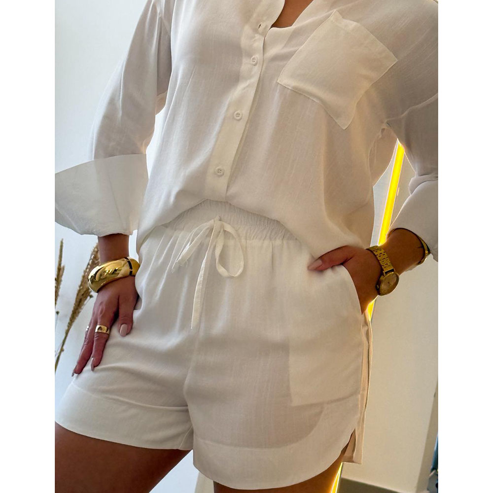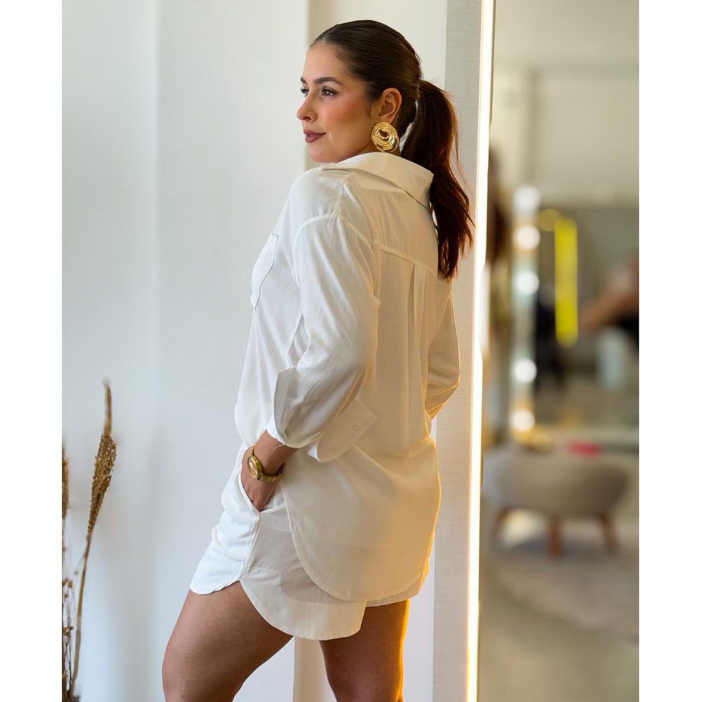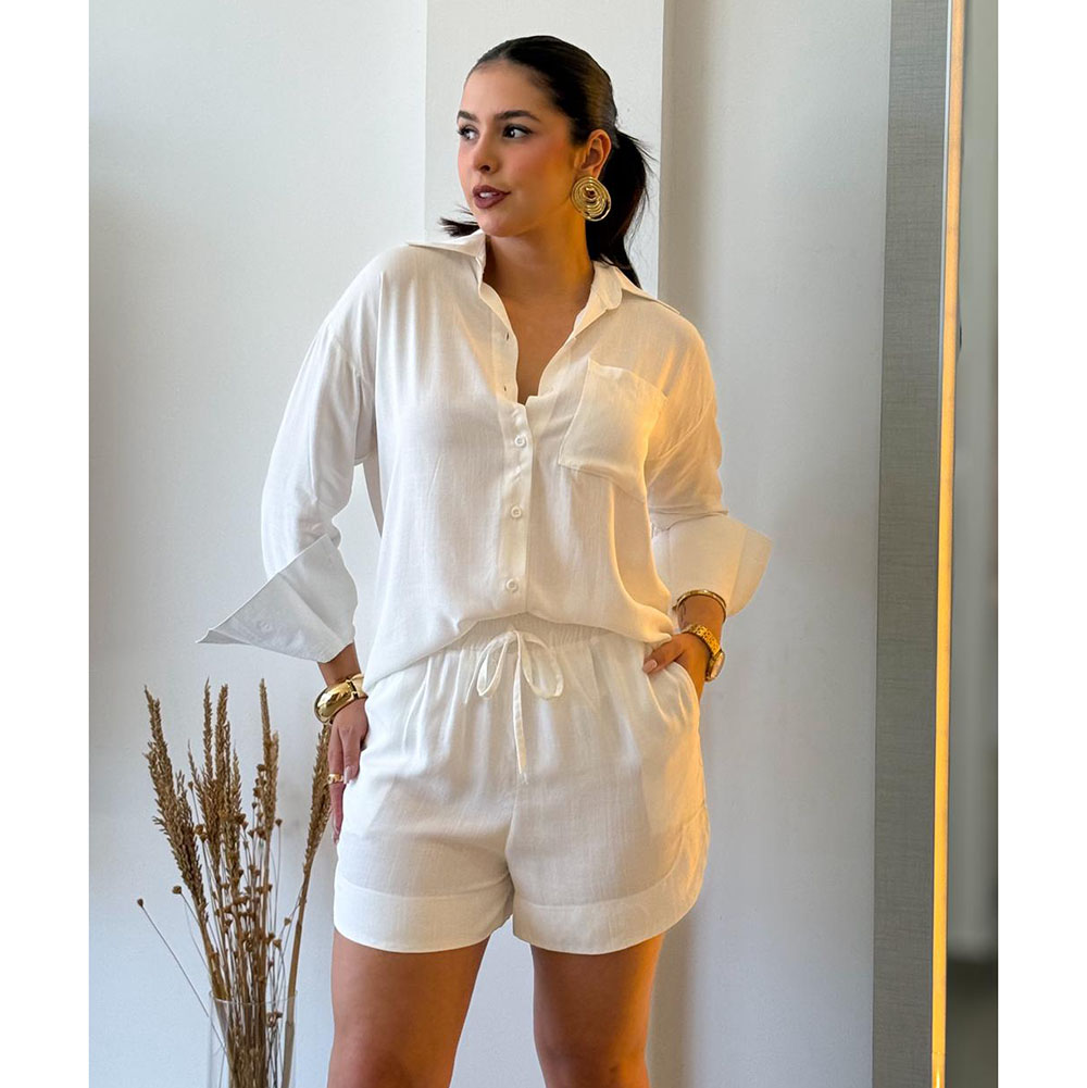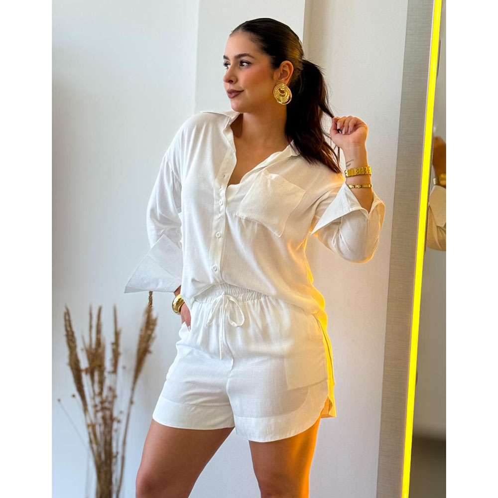 Conjunto em viscolinho, camisa com abertura e fechamento em botões. Possui um bolso frontal e sua modelagem é alongada na parte de trás, short com cós de elástico, amarração fake, dois bolsos frontais e tecido fluido, proporcionando leveza e movimento.