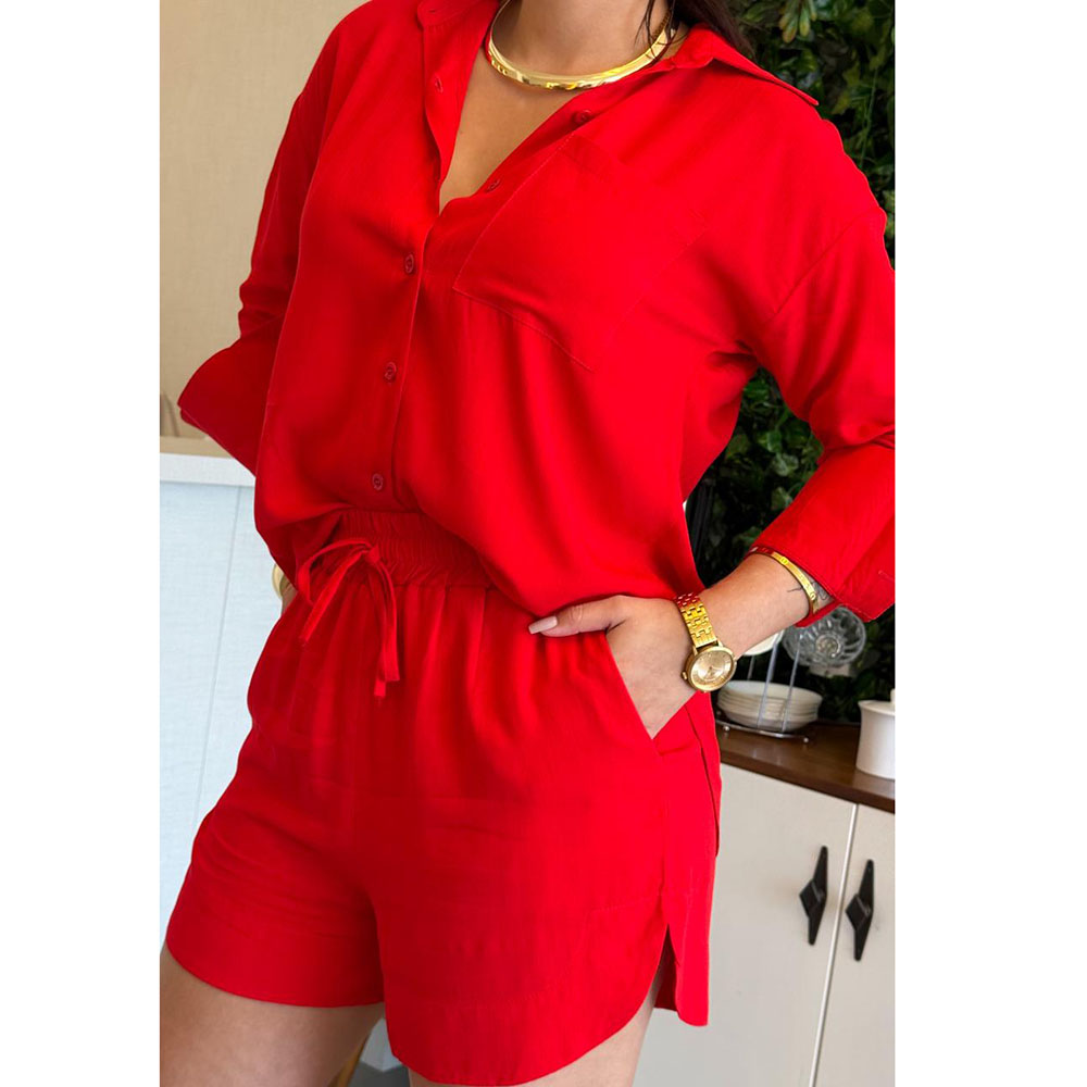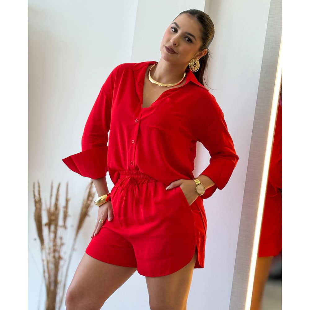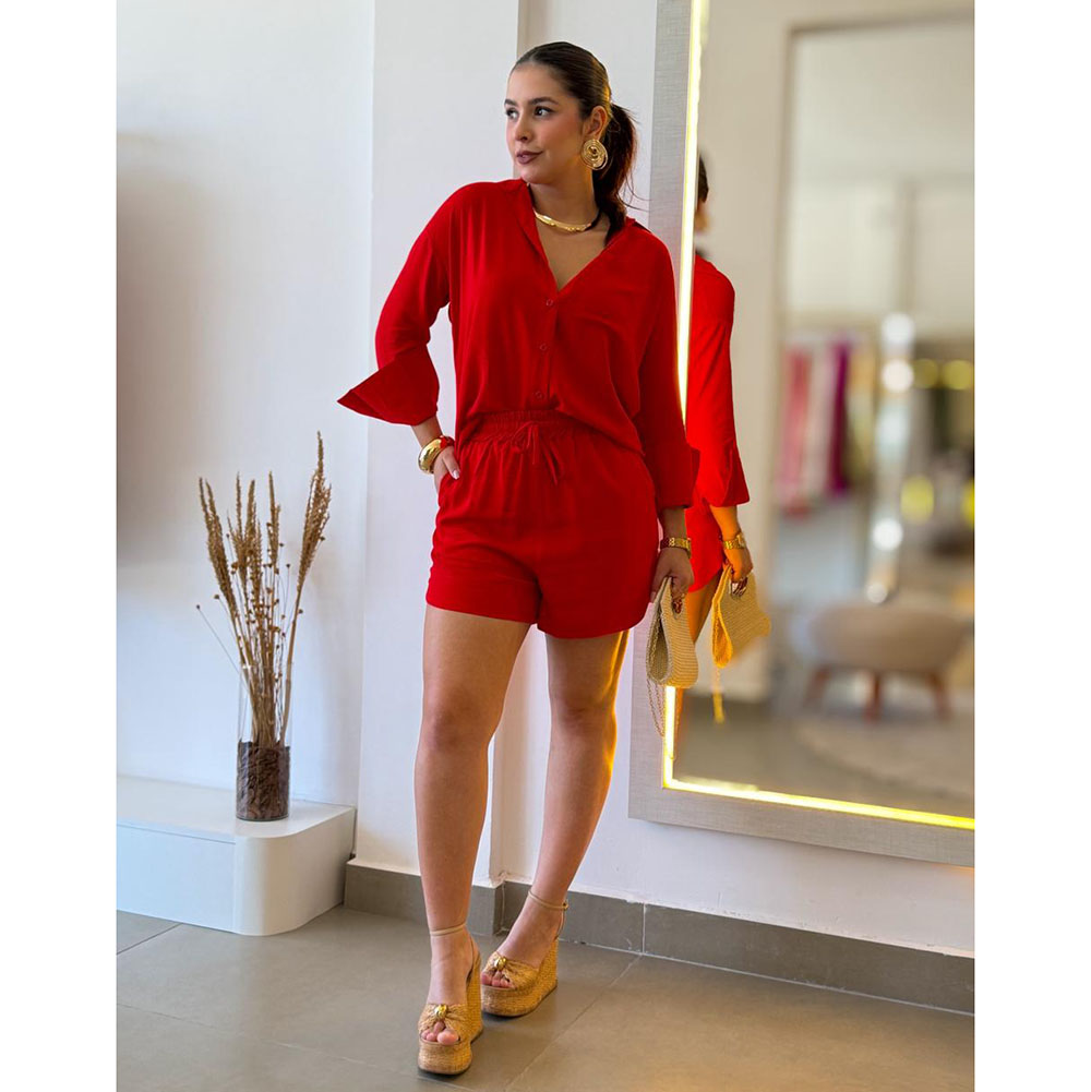 Conjunto em viscolinho, camisa com abertura e fechamento em botões. Possui um bolso frontal e sua modelagem é alongada na parte de trás, short com cós de elástico, amarração fake, dois bolsos frontais e tecido fluido, proporcionando leveza e movimento.