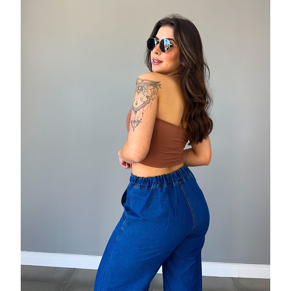 Cropped corselet, tomara que caia, em poliamida, com bojo e elastico na costas.