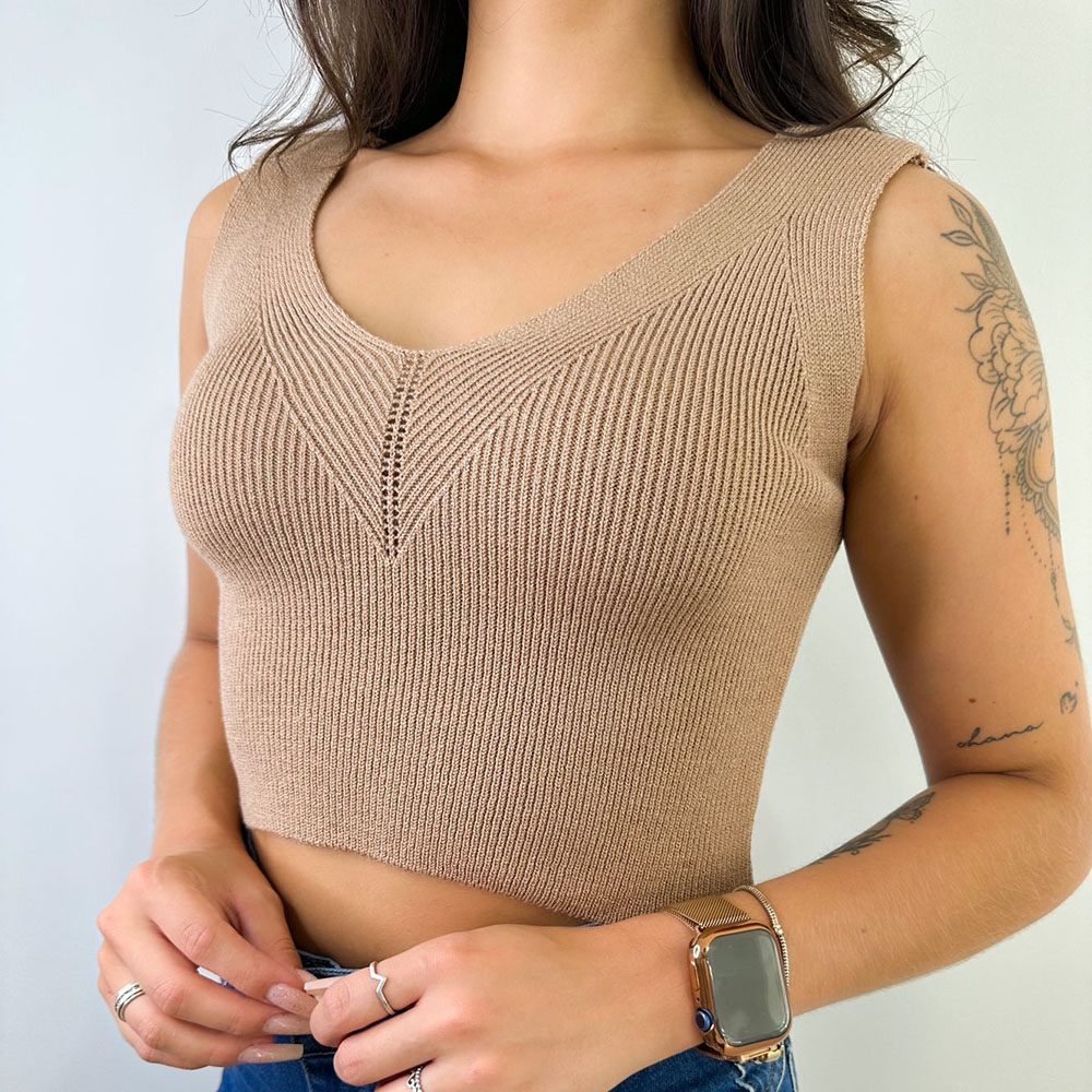 Cropped em Tricot Modal Gola V Nude