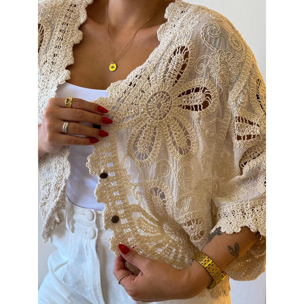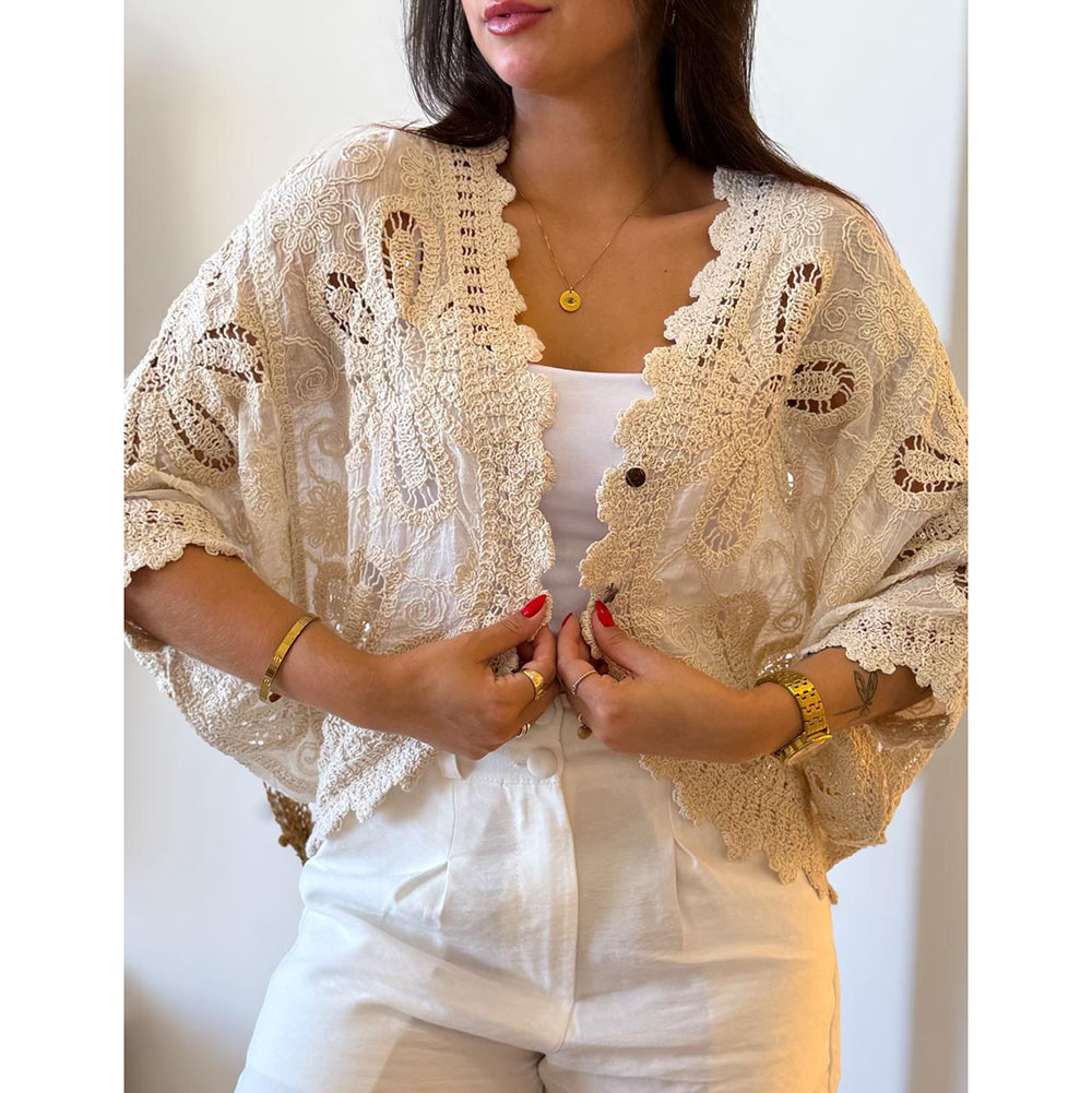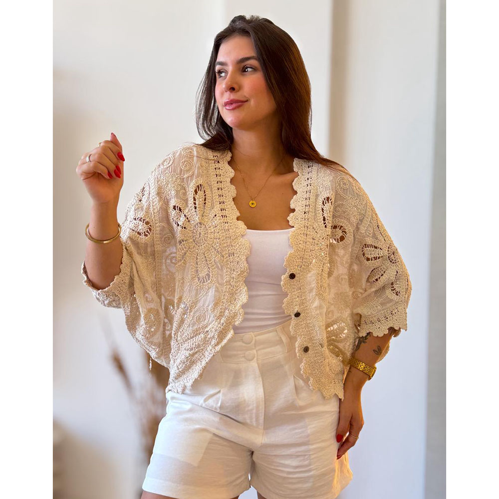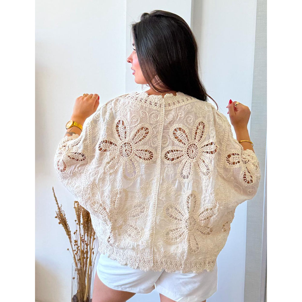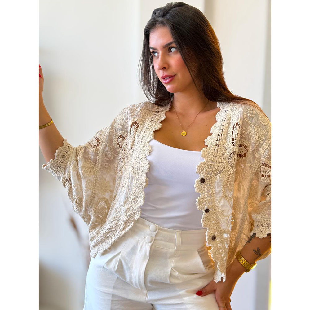 Kimono em Crochê é uma peça única e encantadora, trabalhada artesanalmente para trazer um toque especial. Manga Morcego, possui 3 botões na frente com um toque de elegância e versatilidade. Detalhes em crochê.