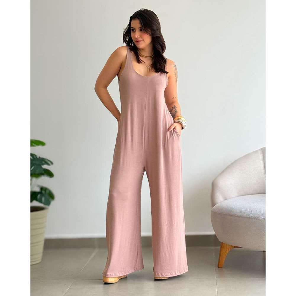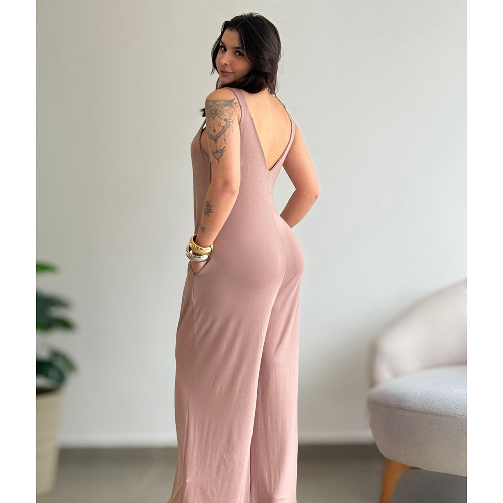 Macacão em tecido viscolycra, modelo regata com decote podendo usar dos dois lados, decote V ou decote redondo. Com dois bolsos na parte da frente.