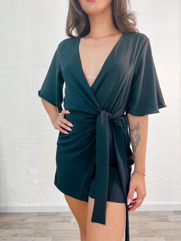 Macaquinho em Duna, manga curta, com elastico na cintura, transpassado, com cordão de amarração.