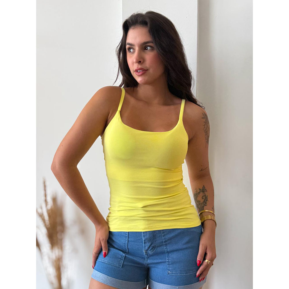 Regata em tecido Poliamida com alça fina e regulavel, possui bojo ( com dupla lycra no busto)