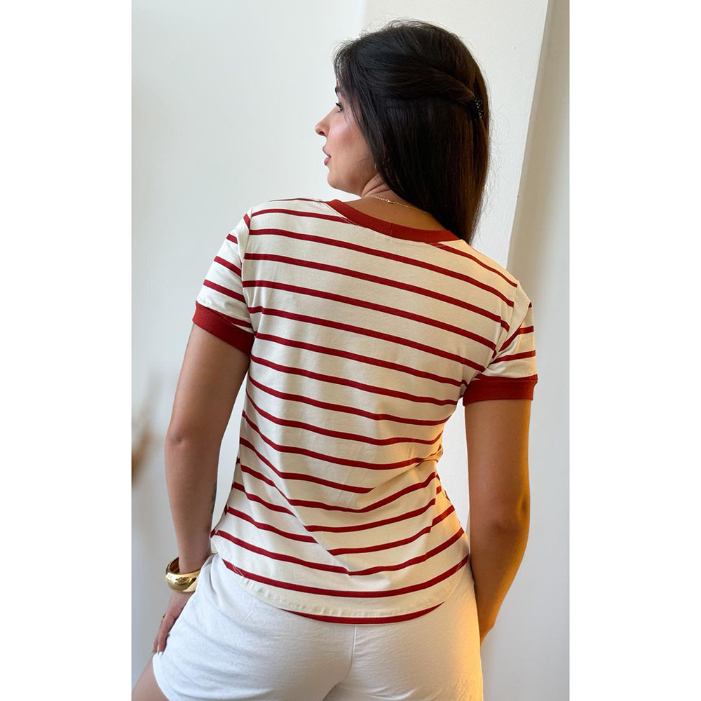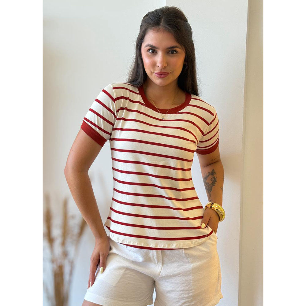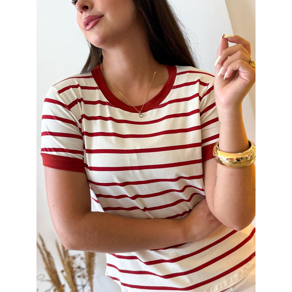 T-shirt em tecido Viscolycra com listras, possui elastano que proporciona conforto e caimento leve. Modelo com mangas, ideal para o dia a dia.