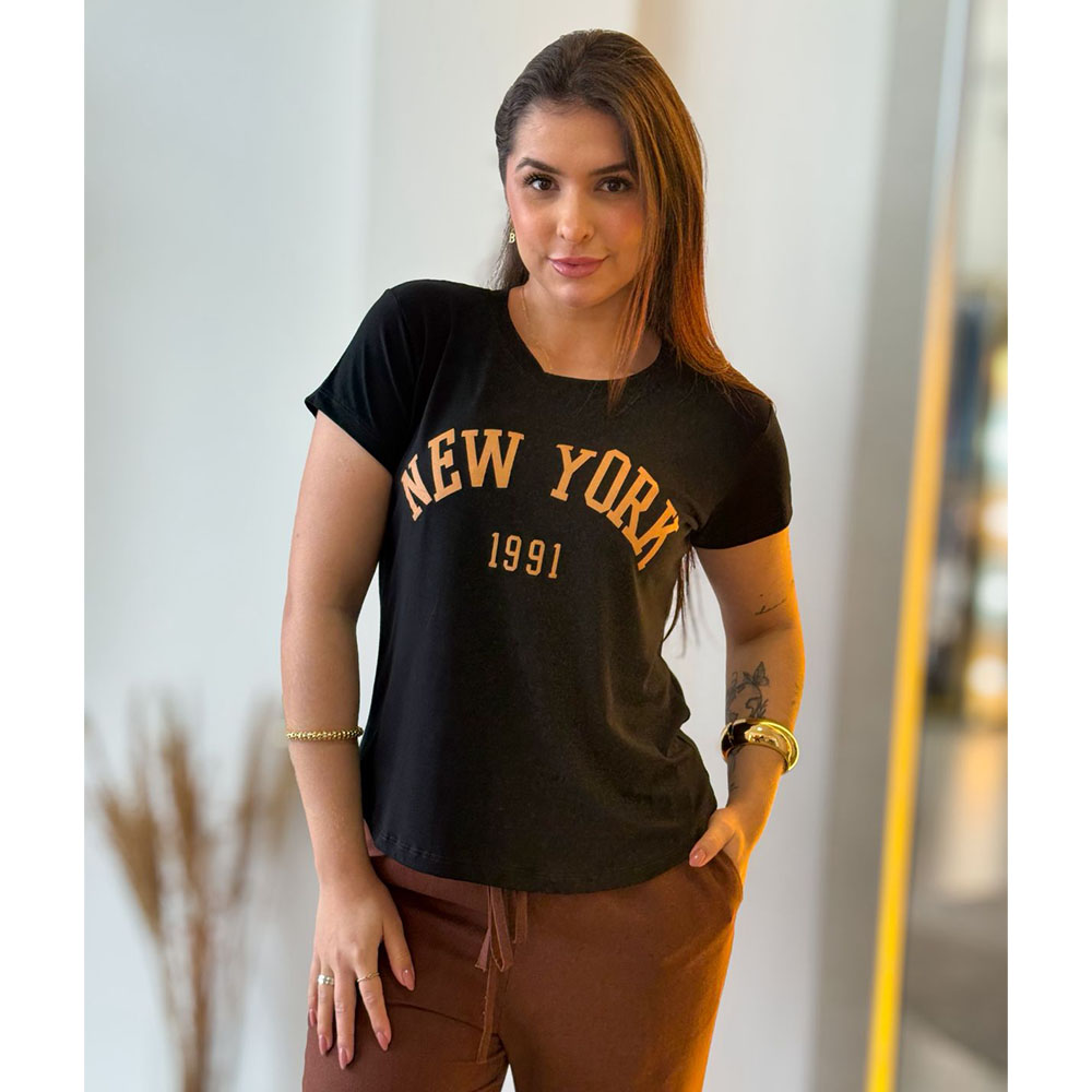 T-shirt em tecido Viscolycra, tecido com elastano que proporciona conforto e caimento leve. Modelo com mangas, ideal para o dia a dia.