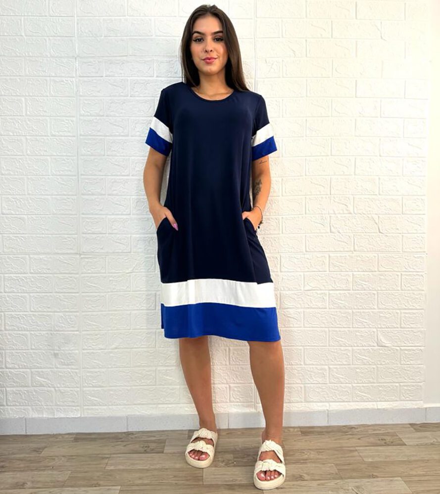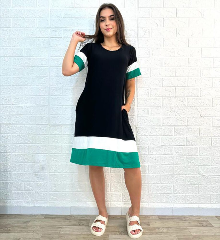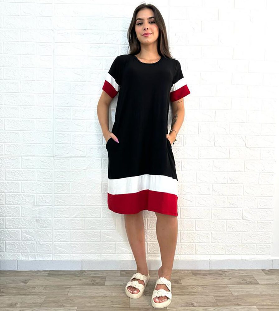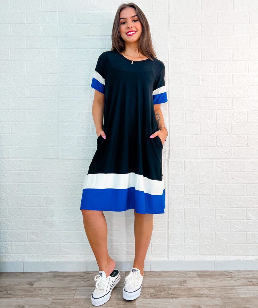 Vestido curto, em malha, gola assimétrica, manga curta, tri color.