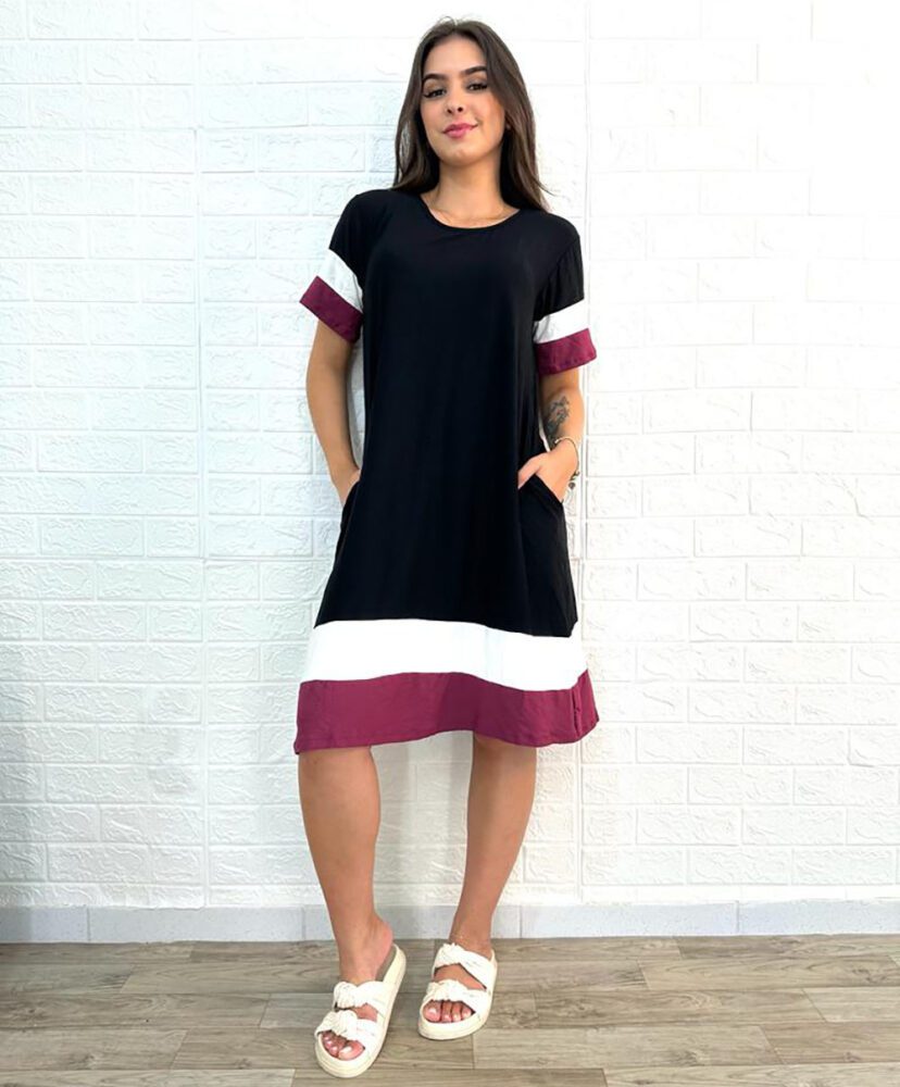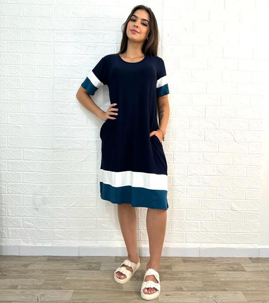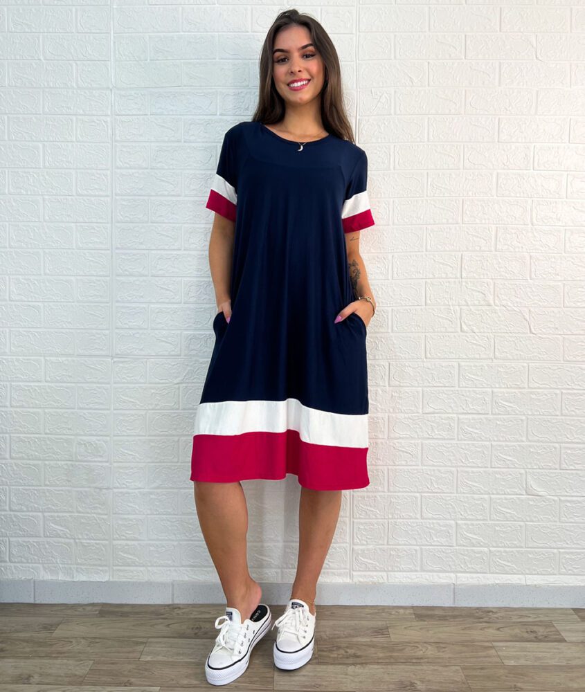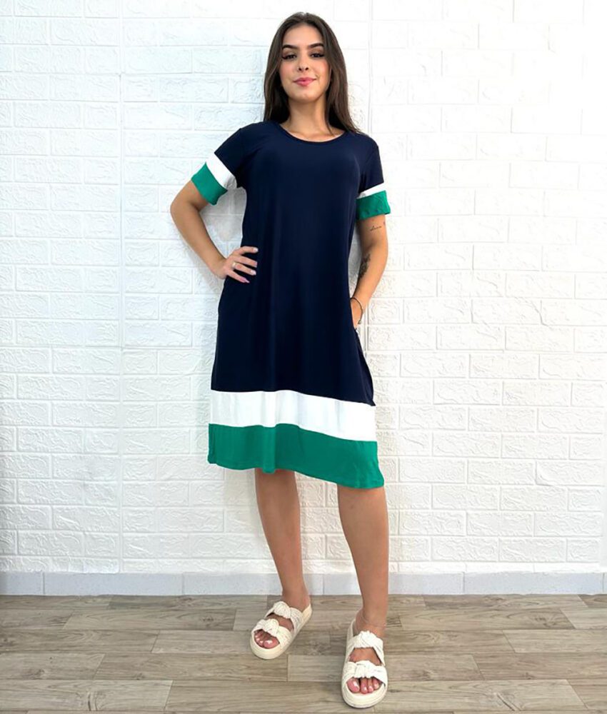Vestido curto, em malha, gola assimétrica, manga curta, tri color.