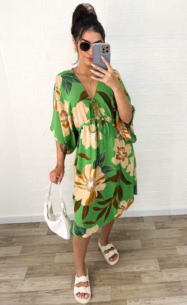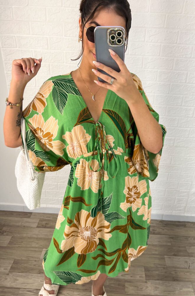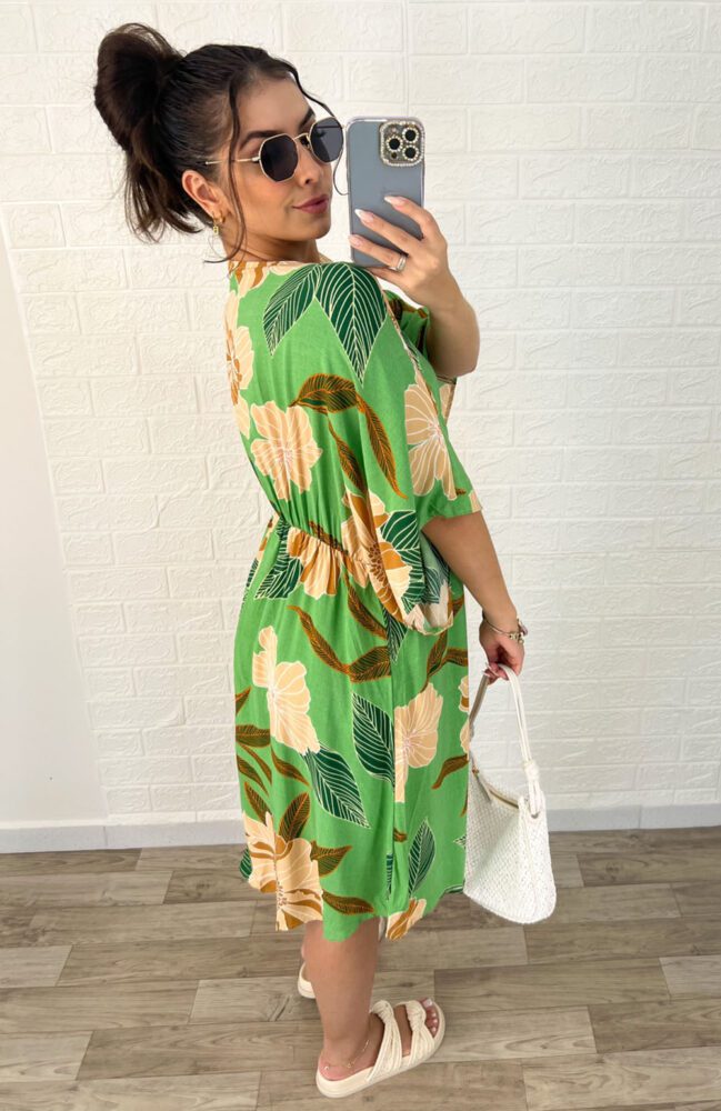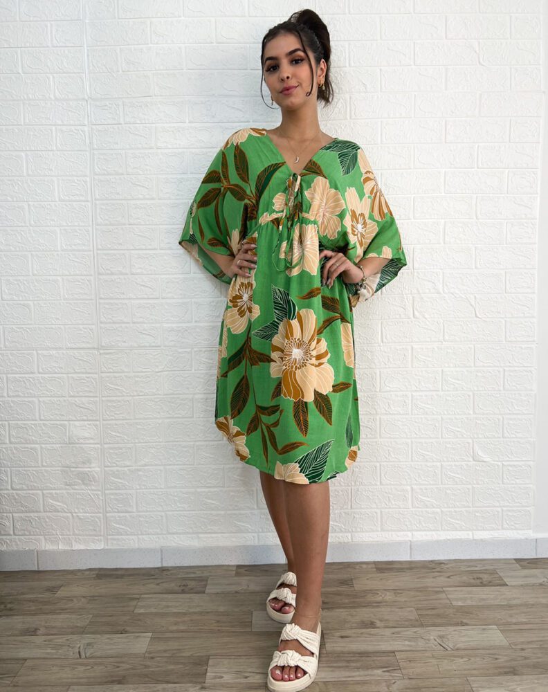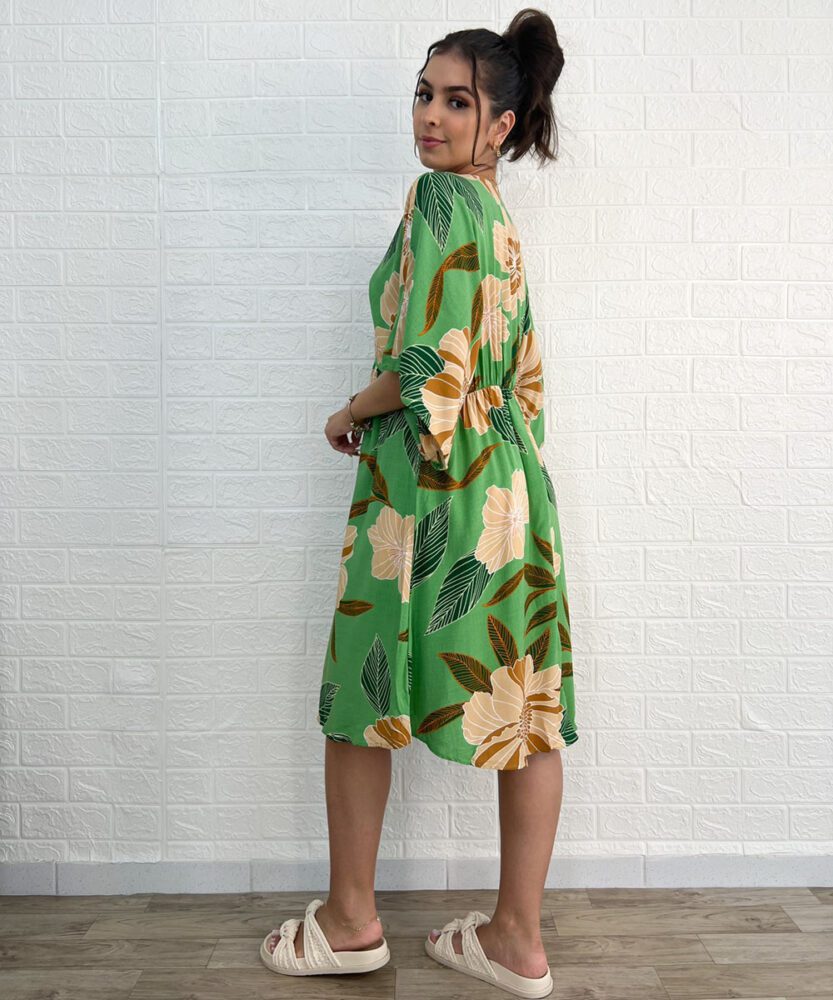 Vestido curto, em Viscolinho, estampado, manga 3/4, cintura ajustável com cordão de amarração.